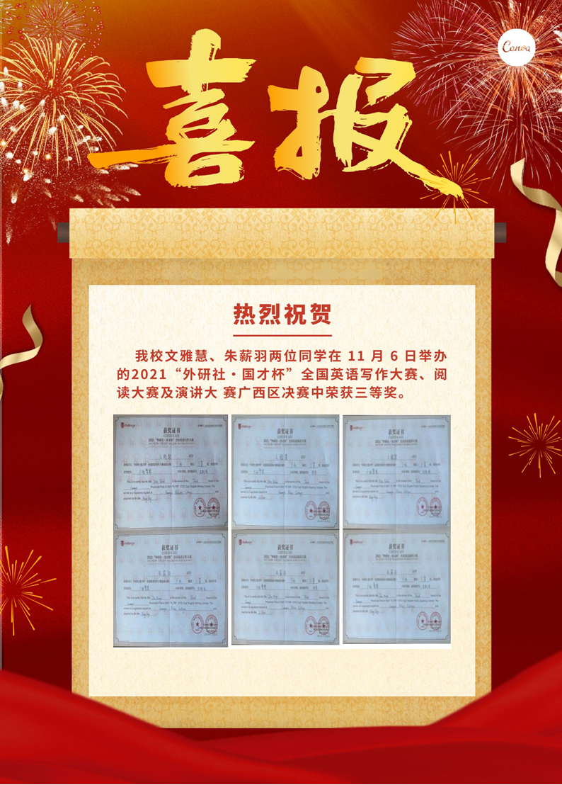 bat365学生在全国英语写作大赛、阅读大赛及演讲大赛广西区决赛中荣获三等奖