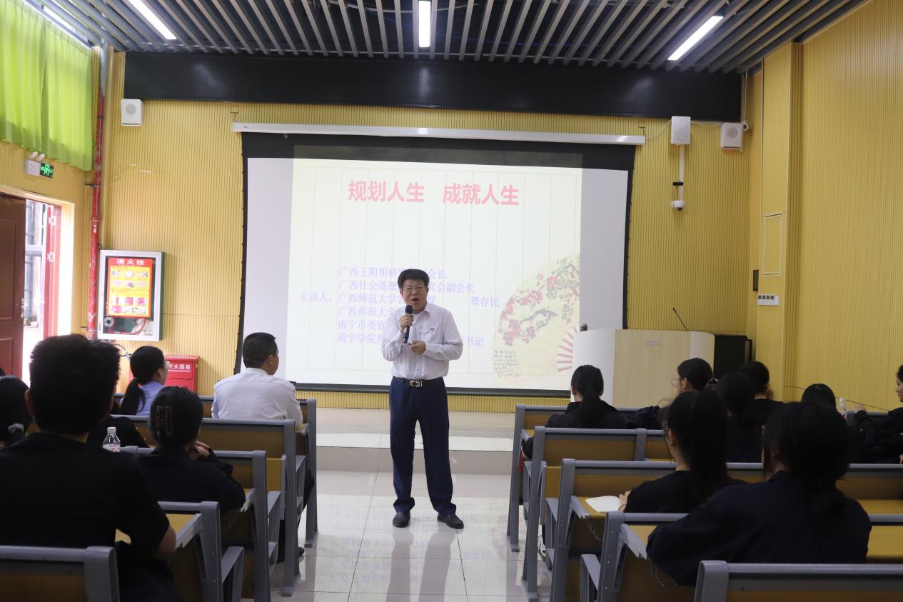 为增强学生们目标意识,提供人生规划思路,让学生懂得如何设定合理目标,避免盲目前行。10月29日下午三点到五点半,“规划人生,成就人生”的学术讲座在五合校区图书馆阶梯教室二举办。此次讲座邀请到了广西王阳明研究会副会长、广西社会道德文化研究会副会长、南宁学院原党委副书记覃存民为主讲老师。参加讲座的领导有农忠海副院长和龙丽珺老师,及23、24级学生和各带队老师。