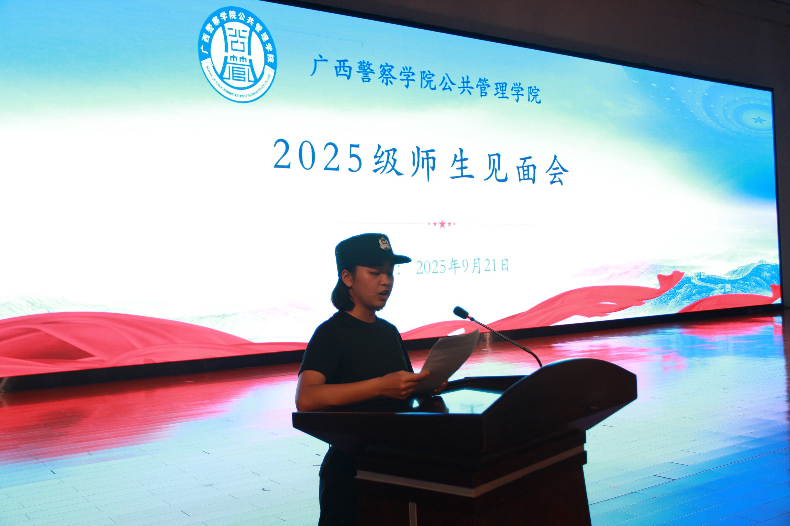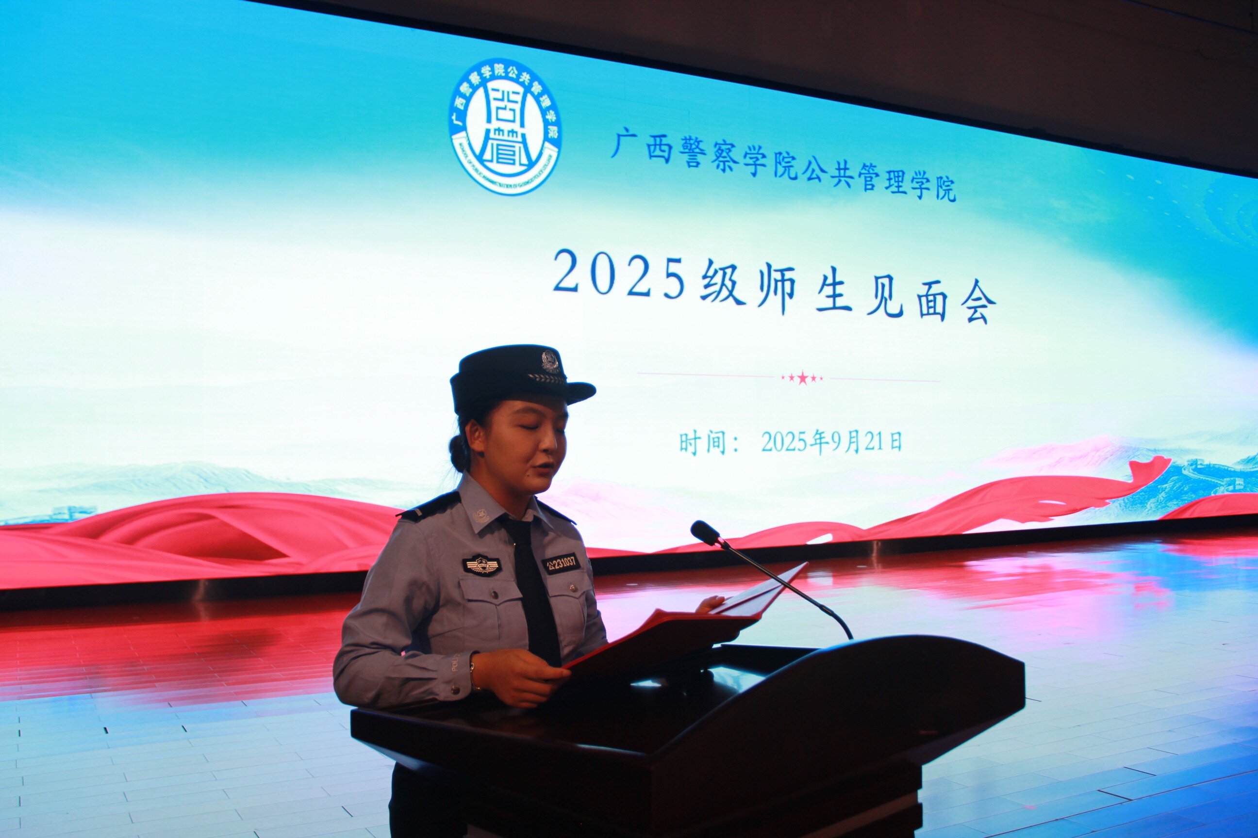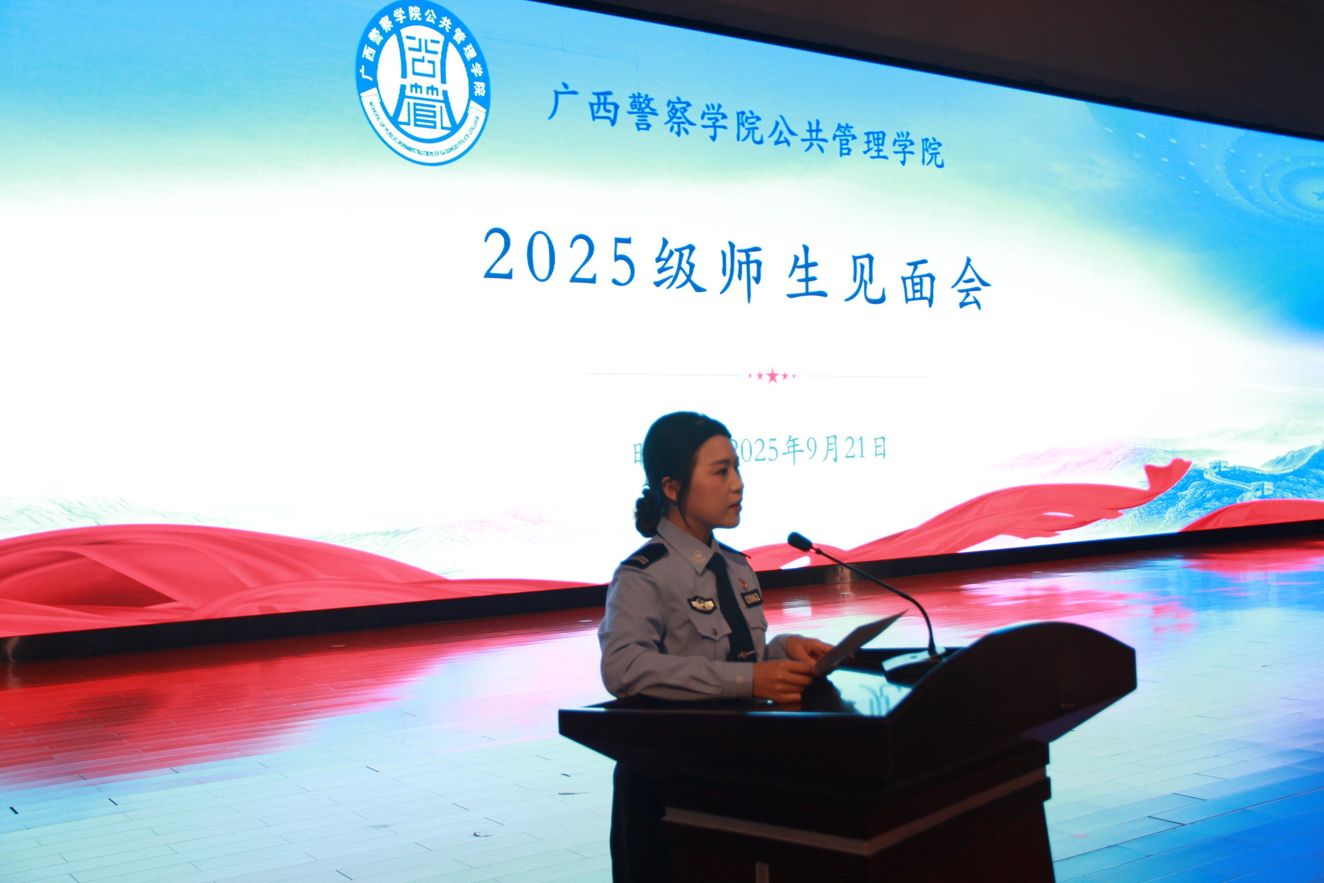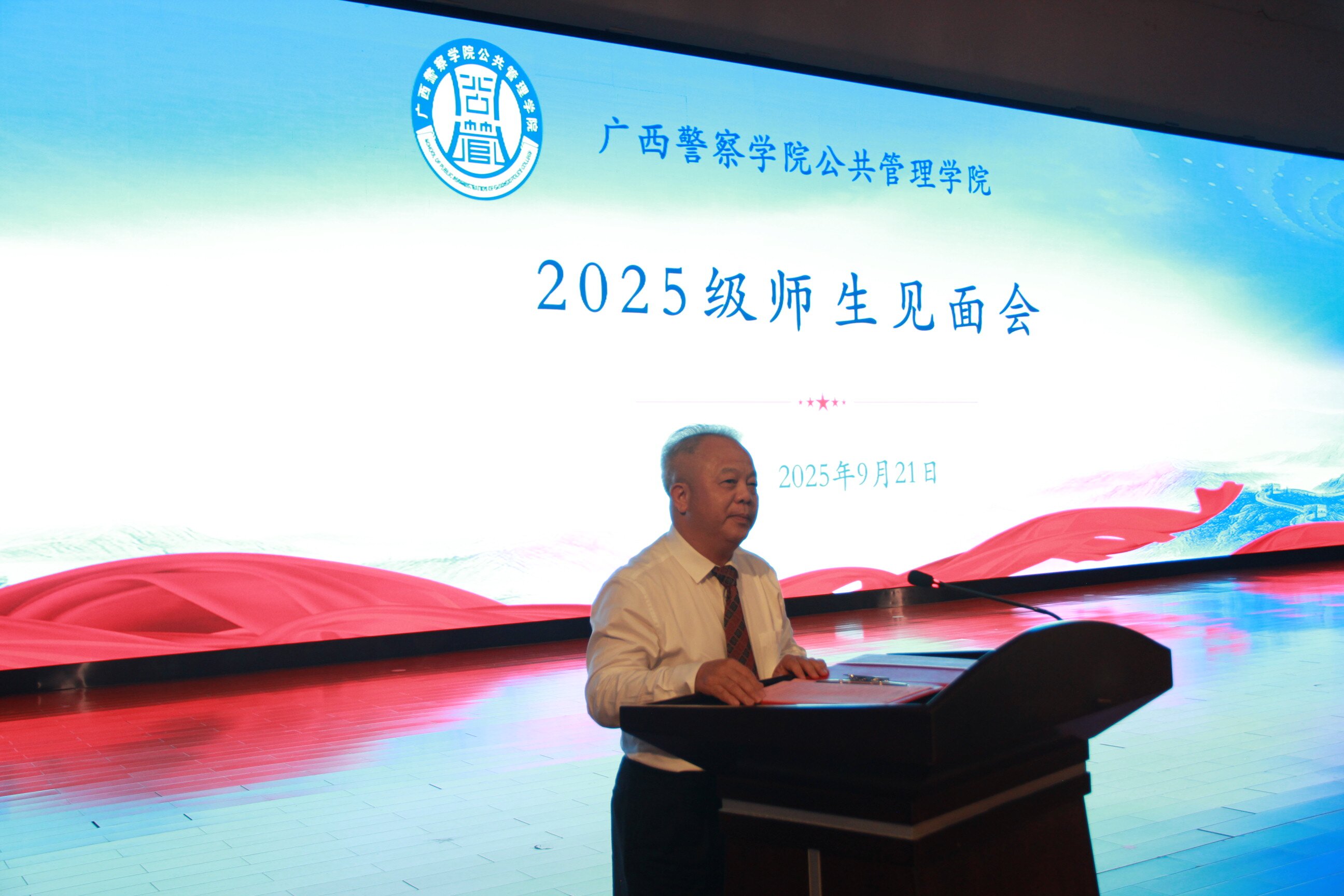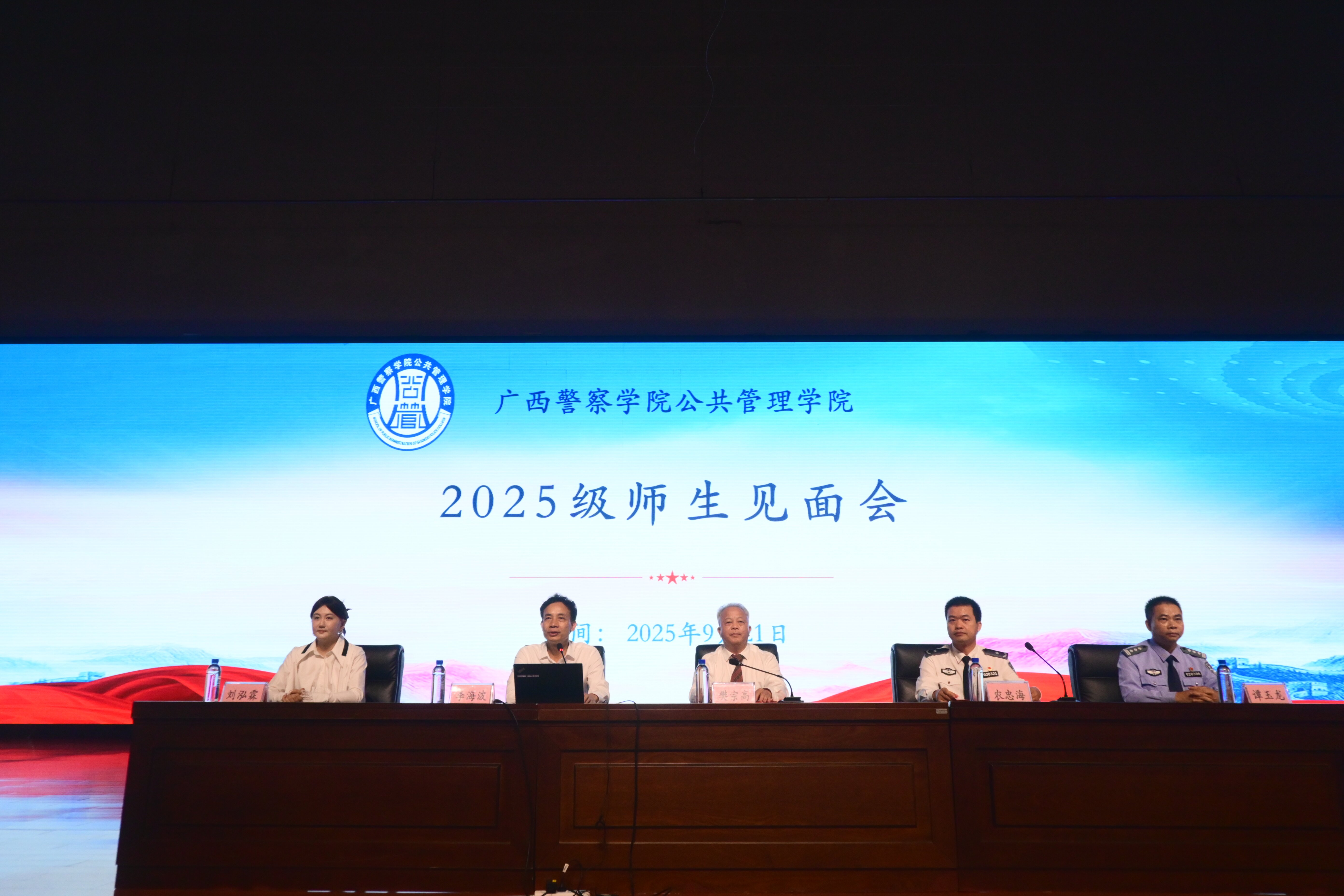 金秋桂馥启新程,藏蓝逐梦警院行。2025年9月21日下午,公共管理学院在仙葫校区学术报告中心隆重举行2025级师生见面会。学院领导班子、北京广慧金通公司驻校办主任、“三办”主任、8个教研室主任、5个研究中心主任、全体辅导员以及2025级全体新生共同参加了本次大会。会议由学院党总支副书记李海波主持。