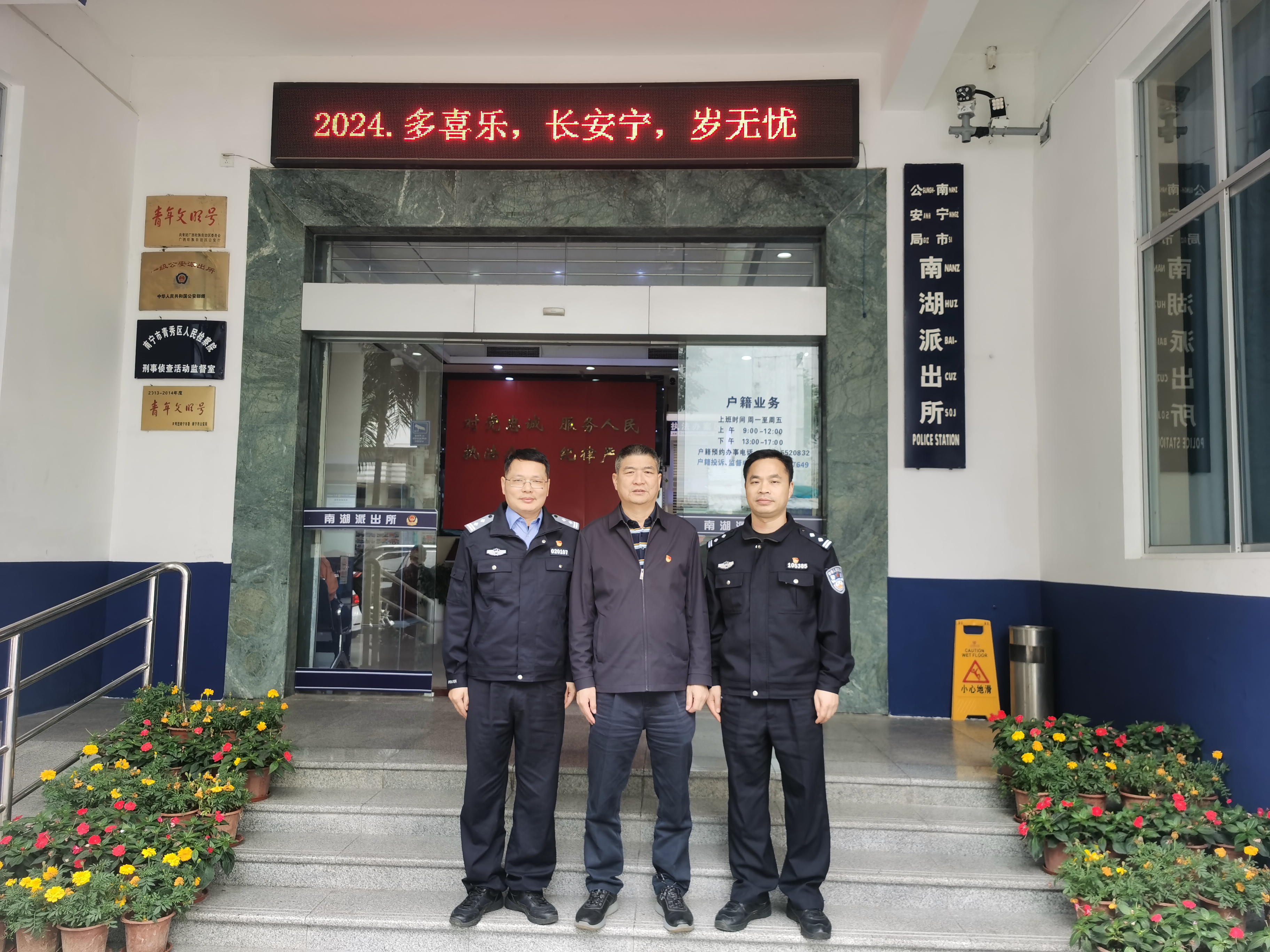 在青秀、大沙田和南湖所,覃健明书记分别了解了潘卜荣、龙萍、高山三位教师的工作和生活情况,勉励他们在基层岗位上要努力工作、虚心求教,严格遵守基层单位各项纪律要求,服从基层所队安排,承担起管理实有人口、掌握社情民意、组织安全防范、破案打击、维护社区秩序、服务辖区群众等工作任务。