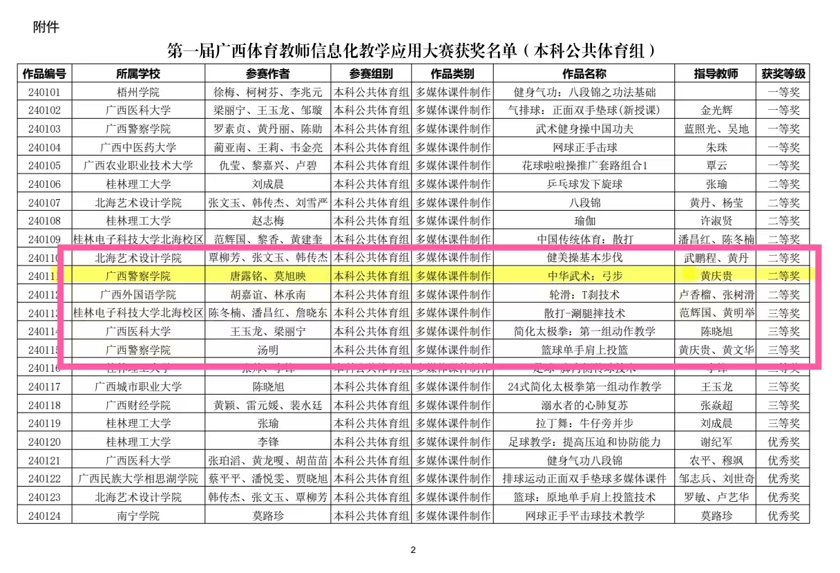 警务实战教研部教师荣获第一届广西体育教师信息化教学应用大赛二等奖、三等奖 来源:警务实战教研部 发布时间:2024-08-25 15:32:24 浏览次数: 次 【字体:小 大】 我部教师唐露铭、莫旭映荣获二等奖、三等奖,指导教师黄庆贵、黄文华。汤明荣获三等奖,指导教师黄庆贵、黄文华。编辑:向磊 审核:莫旭映 签发:黄庆贵 分享到: 【打印正文】