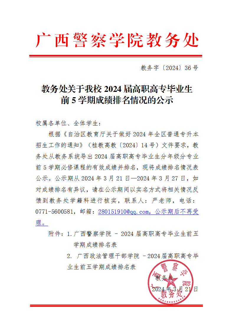 教务处关于bat3652024届高职高专毕业生前5学期成绩排名情况的公示 来源: 发布时间:2024-03-21 15:10:56 浏览次数: 次 【字体:小 大】 附件1:bat365中文官方网站 - 2024届高职高专毕业生前五学期成绩排名表.rar附件2:广西政法管理干部学院 - 2024届高职高专毕业生前五学期成绩排名表.rar 分享到: 【打印正文】