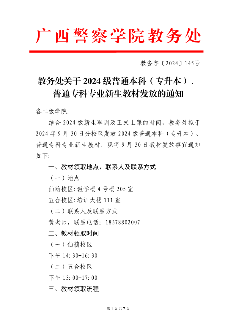教务处关于2024级普通本科(专升本)、普通专科专业新生教材发放的通知