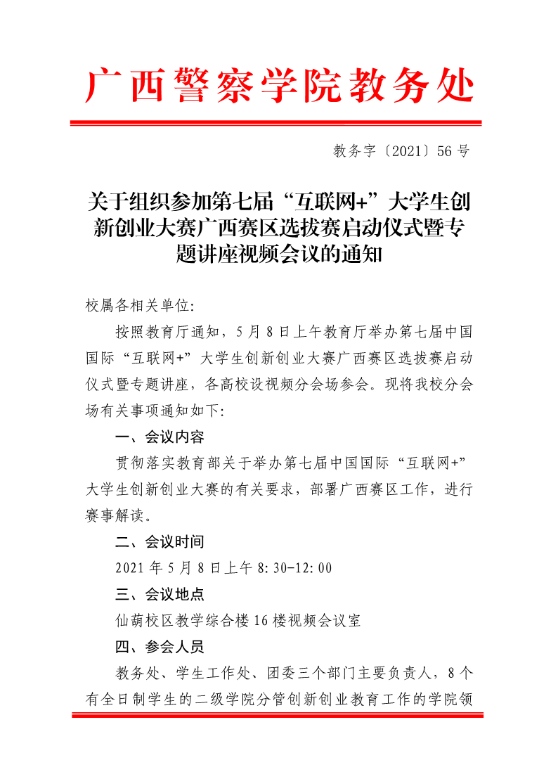 关于组织参加第七届互联网+大学生创新创业大赛广西赛区选拔赛启动仪式暨专题讲座视频会议的通知 来源: 发布时间:2021-05-06 12:10:22 浏览次数: 次 【字体:小 大】 分享到: 【打印正文】