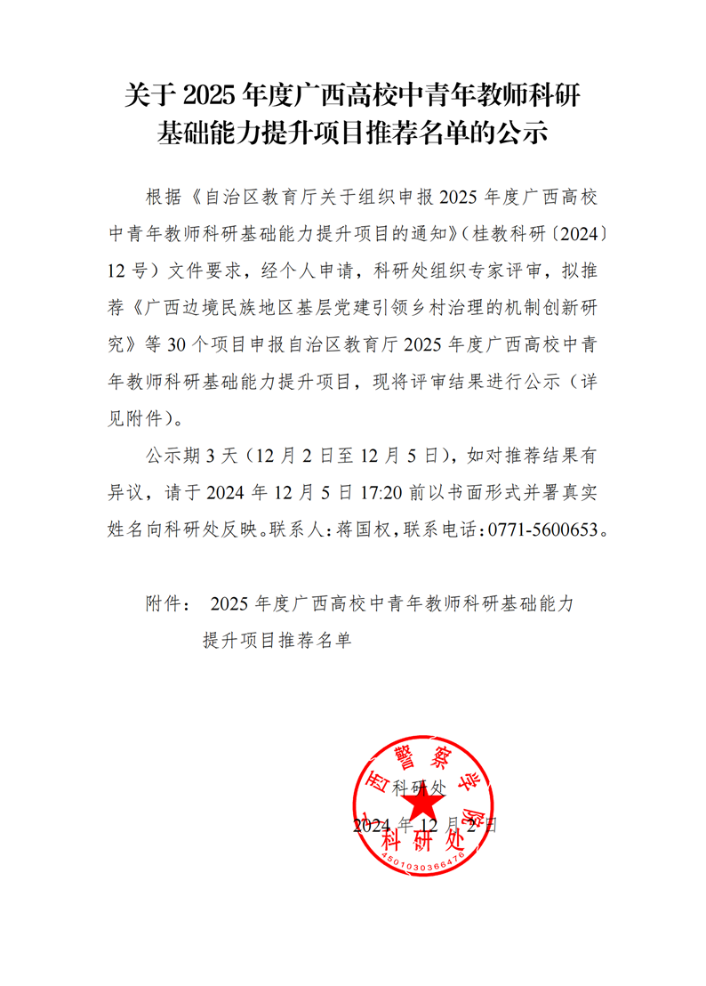 关于2025年度广西高校中青年教师科研基础能力提升项目推荐结果的公示