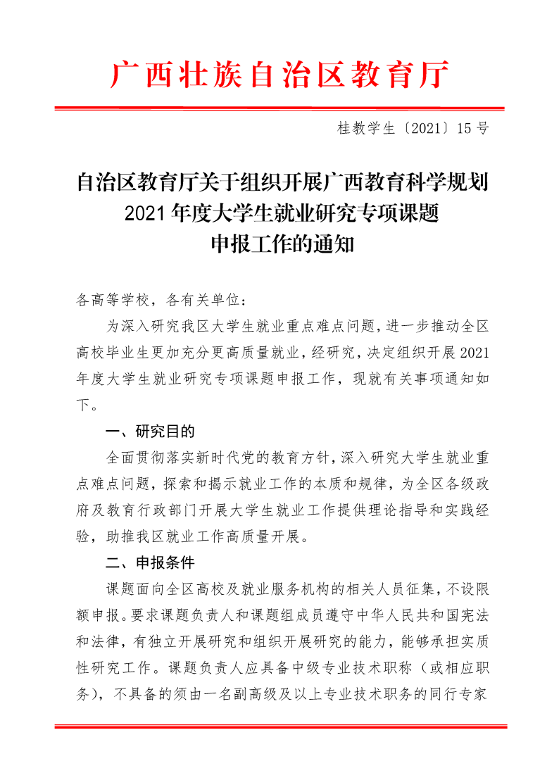桂教学生〔2021〕15号自治区教育厅关于组织开展广西教育科学规划2021年度大学生就业研究专项课题申报工作的通知 来源: 发布时间:2021-09-30 15:55:25 浏览次数: 次 【字体:小 大】 智能标签: 教育厅 组织 就业研究 专项课题 分享到: 【打印正文】 相关内容