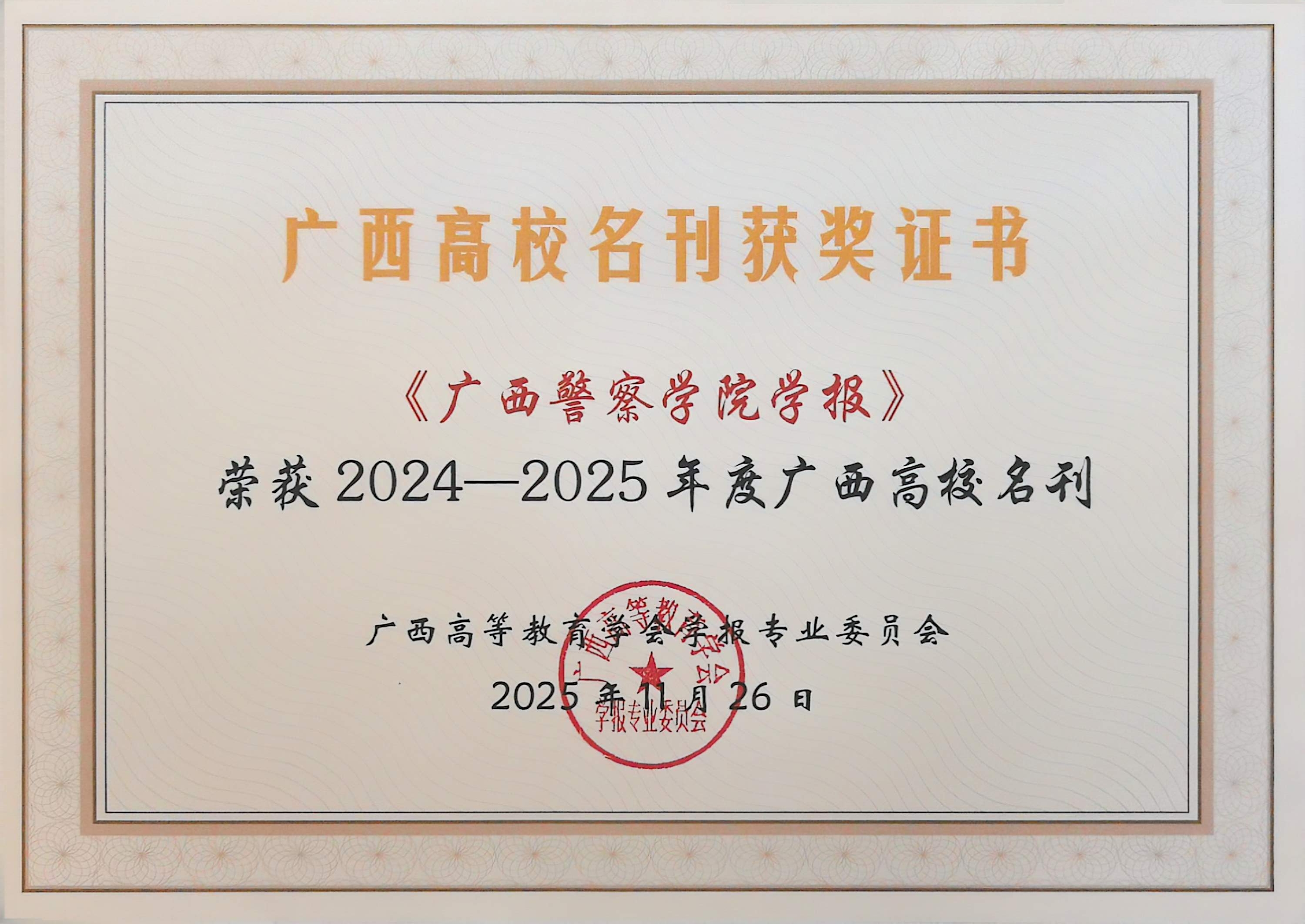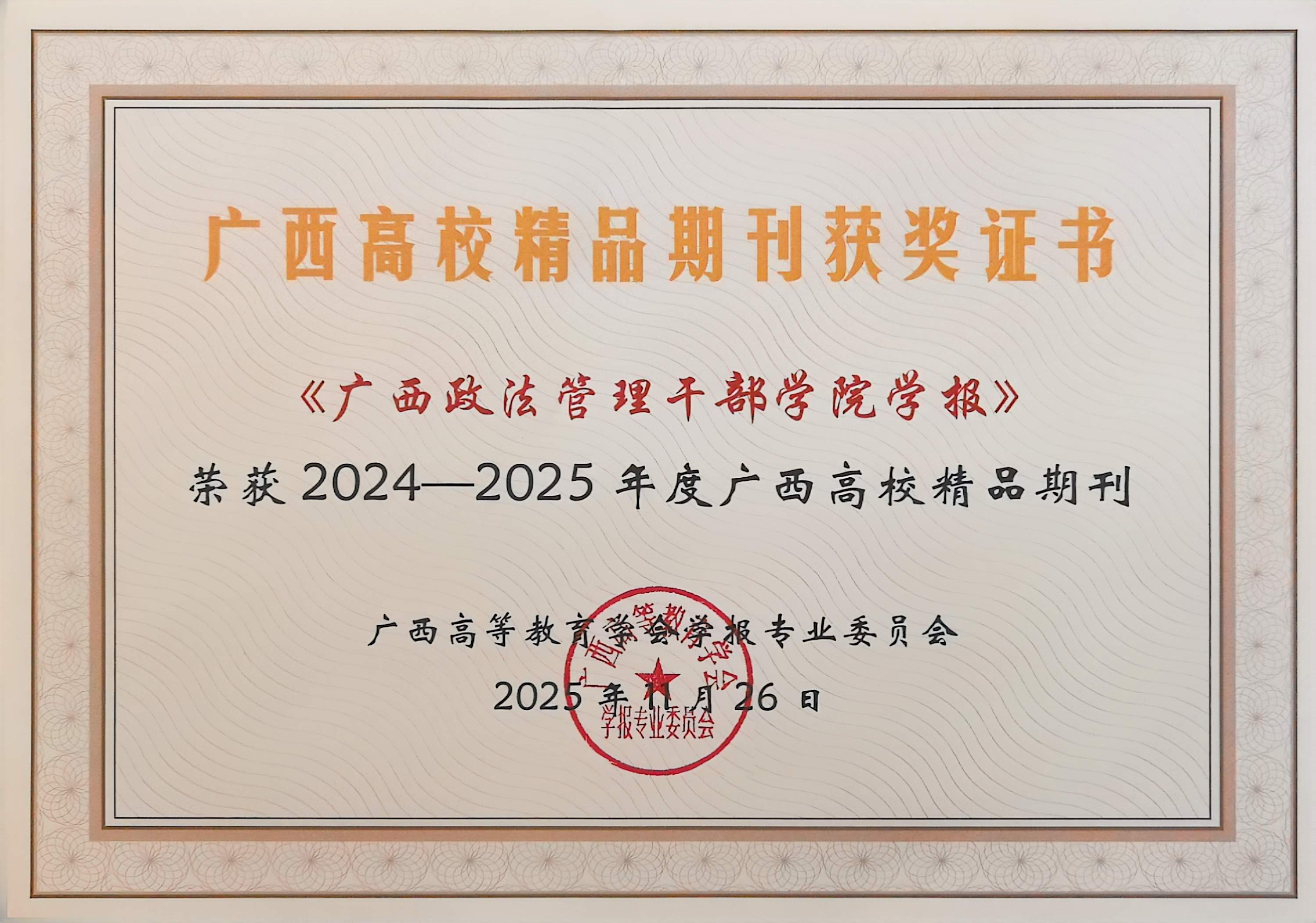 在本次评优活动中,编辑部喜获多项奖励。《bat365中文官方网站学报》获评2024—2025年度广西高校名刊,《广西政法管理干部学院学报》获评2024—2025年度广西高校精品期刊。陈华、唐德才获评2025年度广西高校学报优秀主编,王真真、刘少霞、唐颖菲、袁翠微获评2025年度广西高校学报优秀编辑。