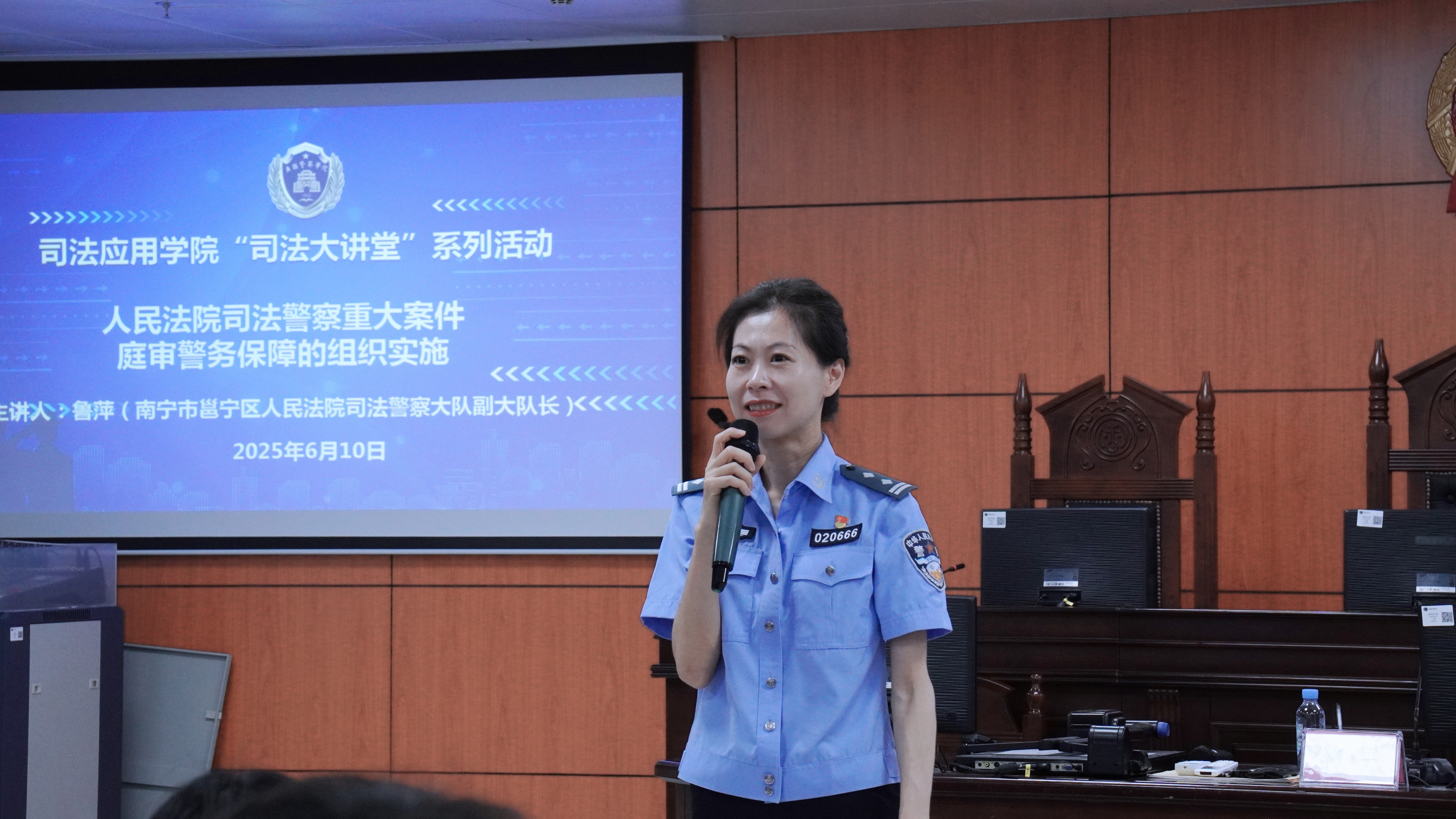 6月10日下午,司法应用学院“司法大讲堂”第十一讲在五合校区二号实训楼201顺利举行。本次讲座以“人民法院司法警察重大案件庭审警务保障的组织实施”为主题,特邀南宁市邕宁区人民法院司法警察大队副大队长鲁萍担任主讲嘉宾,司法应用学院副院长谢曼娜主持活动,学院师生共同参与学习。