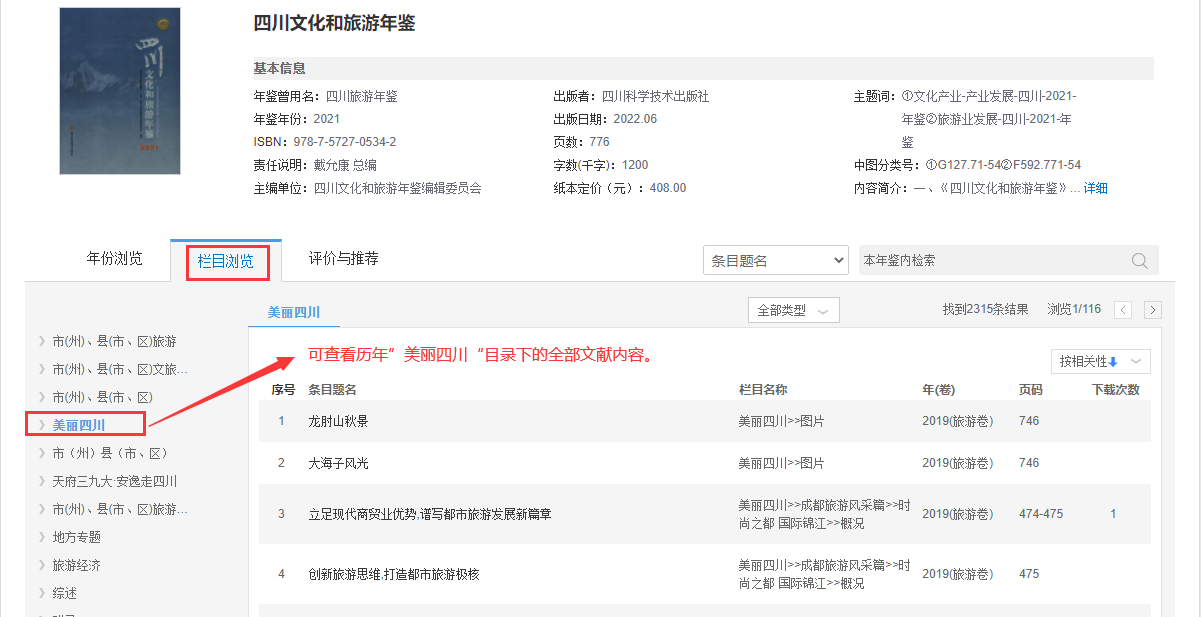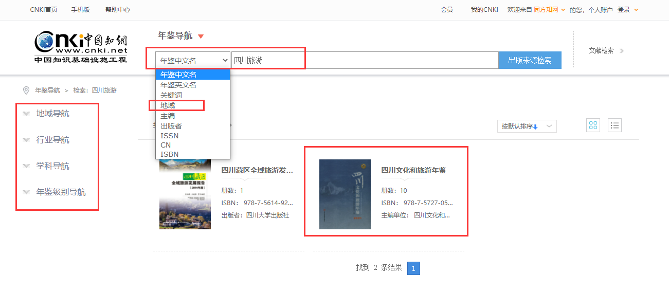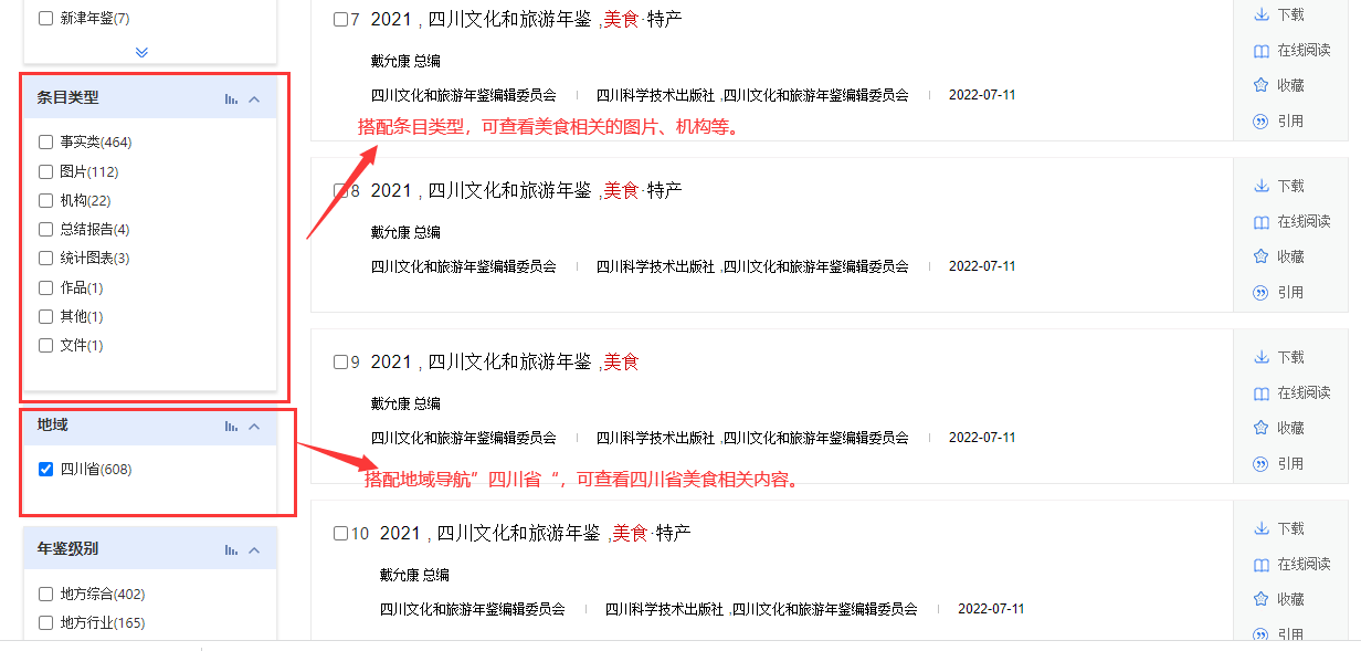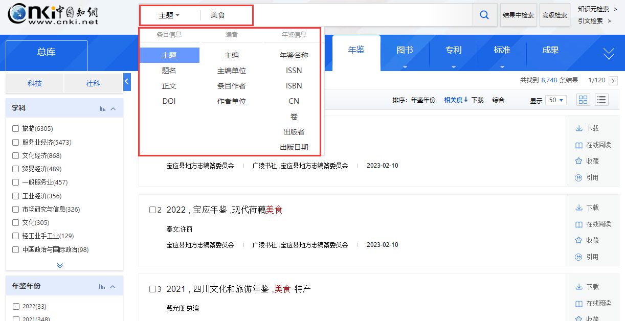 年鉴可通过条目检索、知网节、整刊检索进行发现与利用文献,有丰富的导航体系,可通过搭配导航体系进行复合筛选。