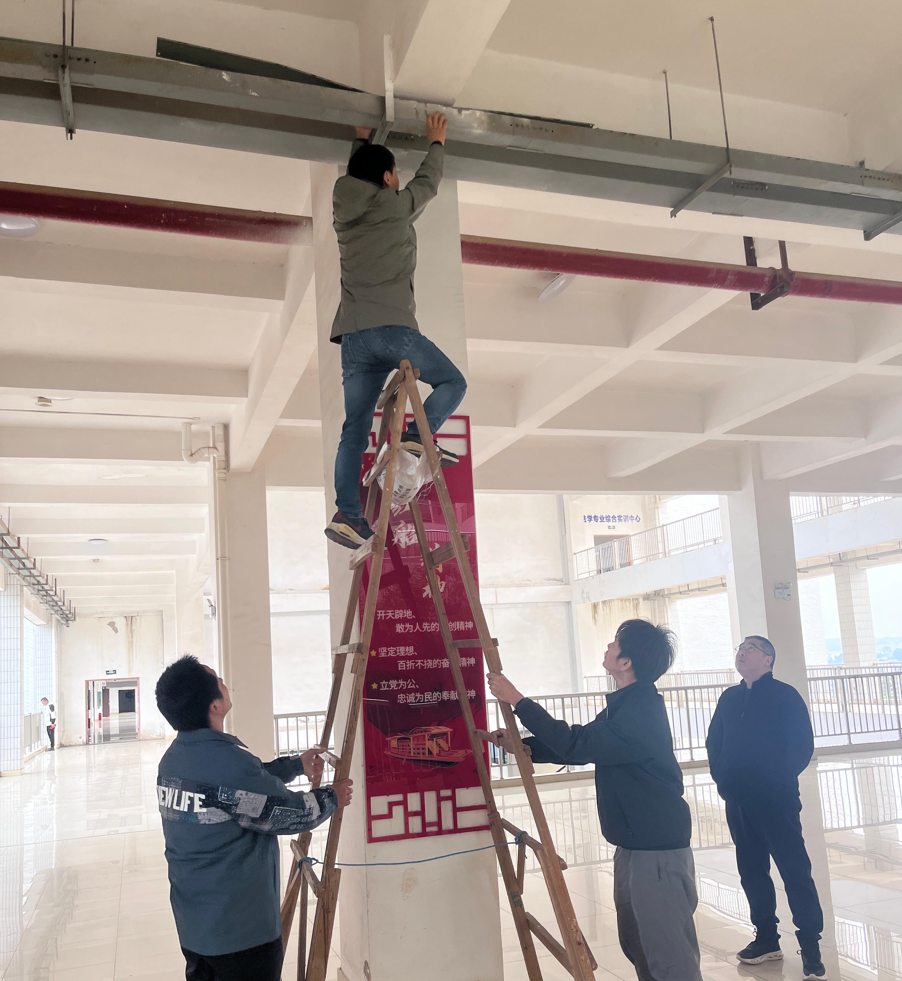 图2:对五合校区教室走廊弱电桥架松动的盖板进行捆扎