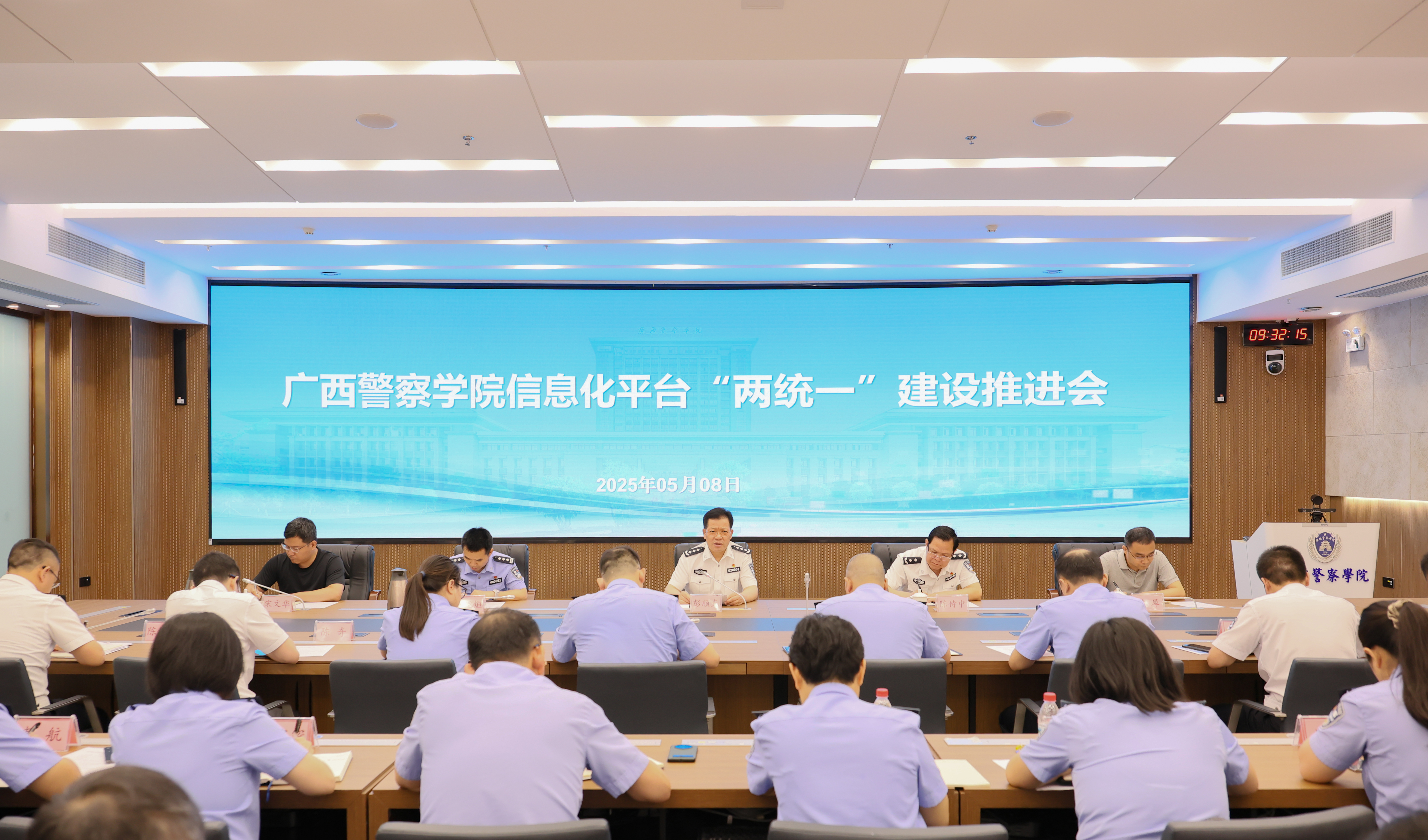 为贯彻落实自治区公安厅召开的广西公安高等教育高质量发展工作推进会精神,推动学校统一身份认证与统一门户融合平台上线运行,5月8日,学校召开信息化平台“两统一”建设推进会。学校党委书记彭顺克主持会议并讲话,校党委委员、副校长陈恃中,自治区公安厅数侦总队副总队长唐运烜出席会议。