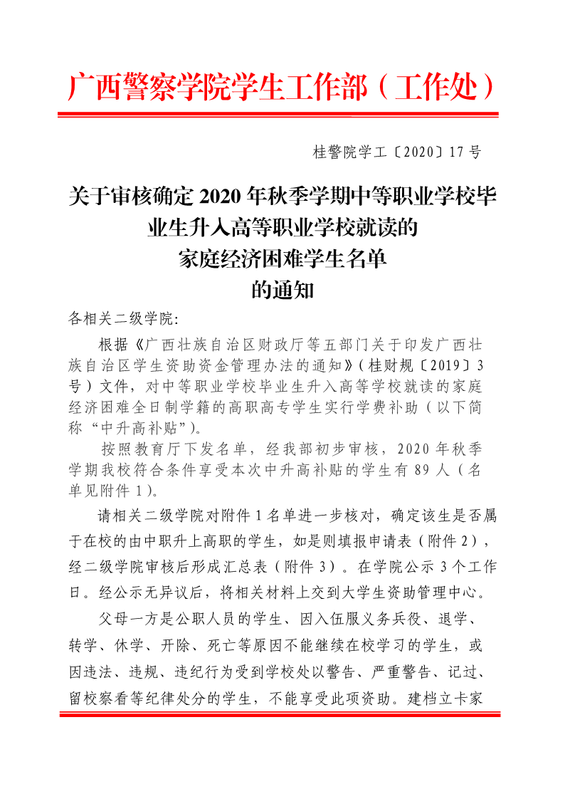 关于开展2020秋季学期中等职业学校毕业生升入高等职业学校就读的家庭经济困难学生享受学费补助工作的通知 来源: 发布时间:2020-11-27 10:50:07 浏览次数: 次 【字体:小 大】 附件1:2020年秋季学期中职升高职经济困难学生学费补助名单.xlsx附件2:中等职业学校毕业生升入高等学校就读的家庭经济困难学生学费补助申请表.doc附件3:中职升入高职家庭经济困难获补助学生汇总表.xlsx 分享到: 【打印正文】