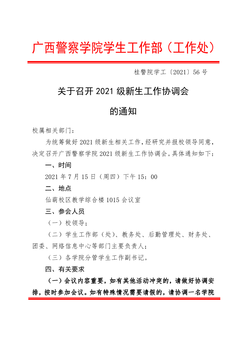 关于召开2021级新生工作协调会的通知