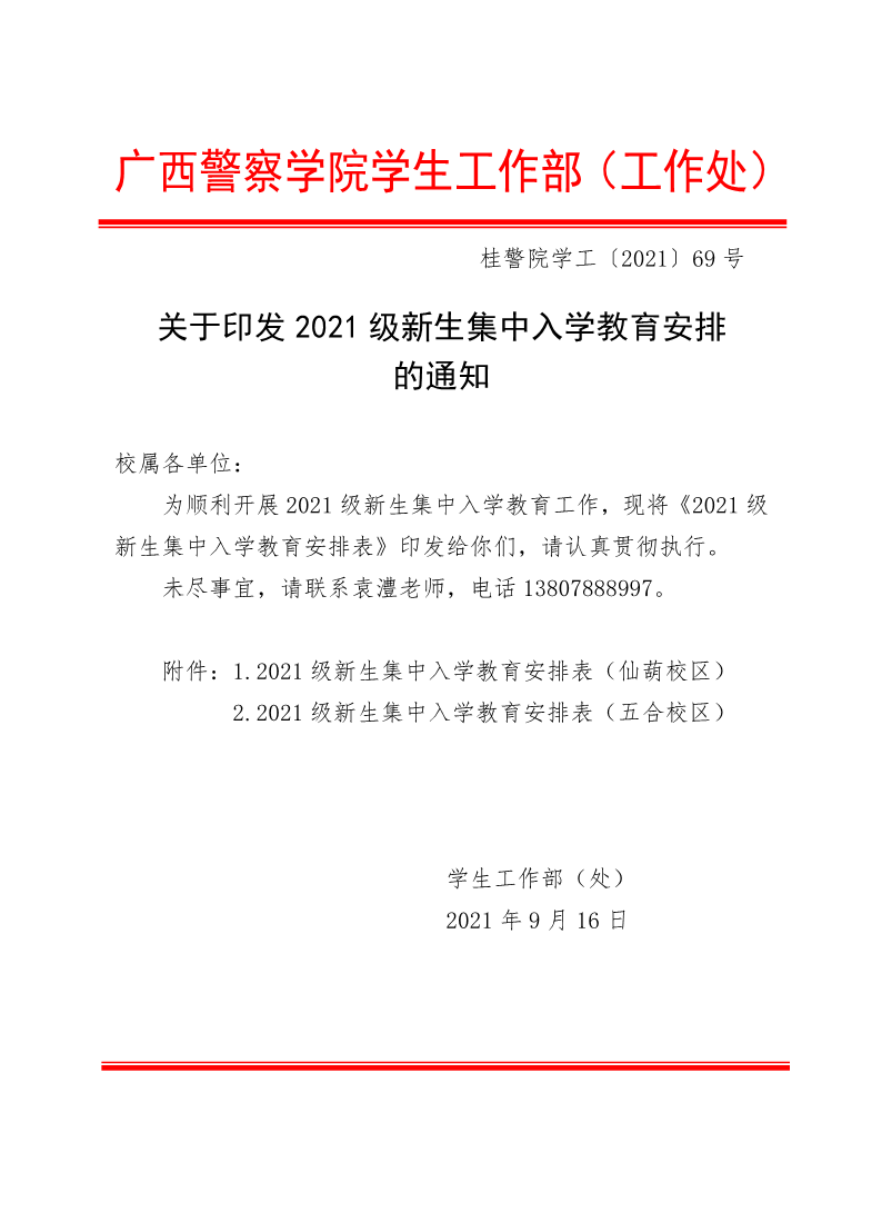 关于印发2021级新生集中入学教育安排表的通知