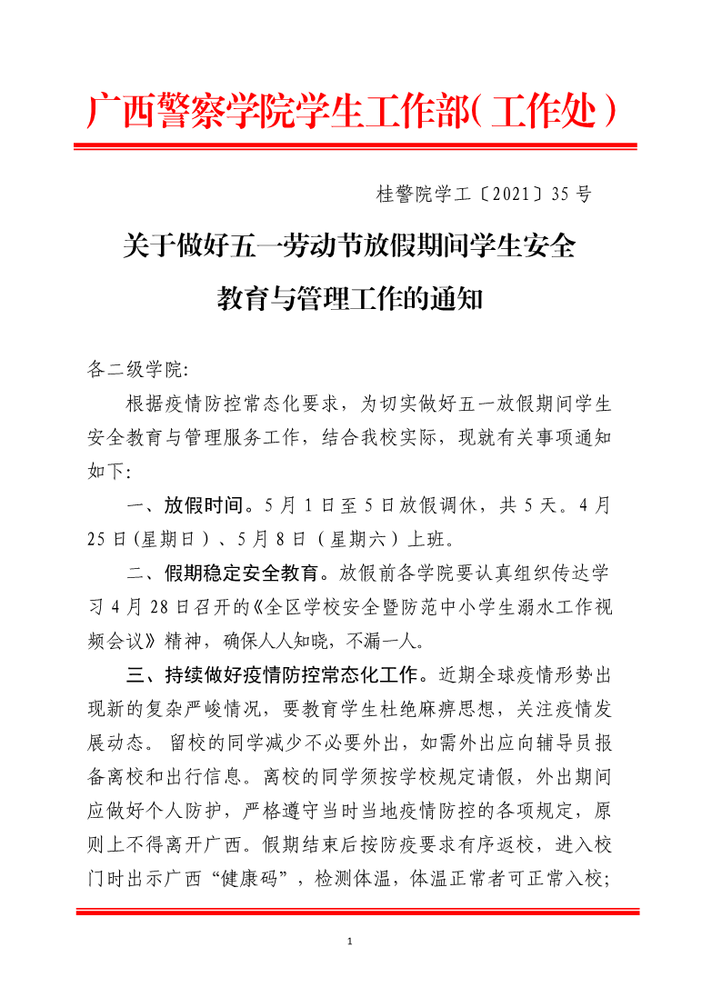 关于做好2021年五一劳动节放假期间学生安全教育与管理工作的通知