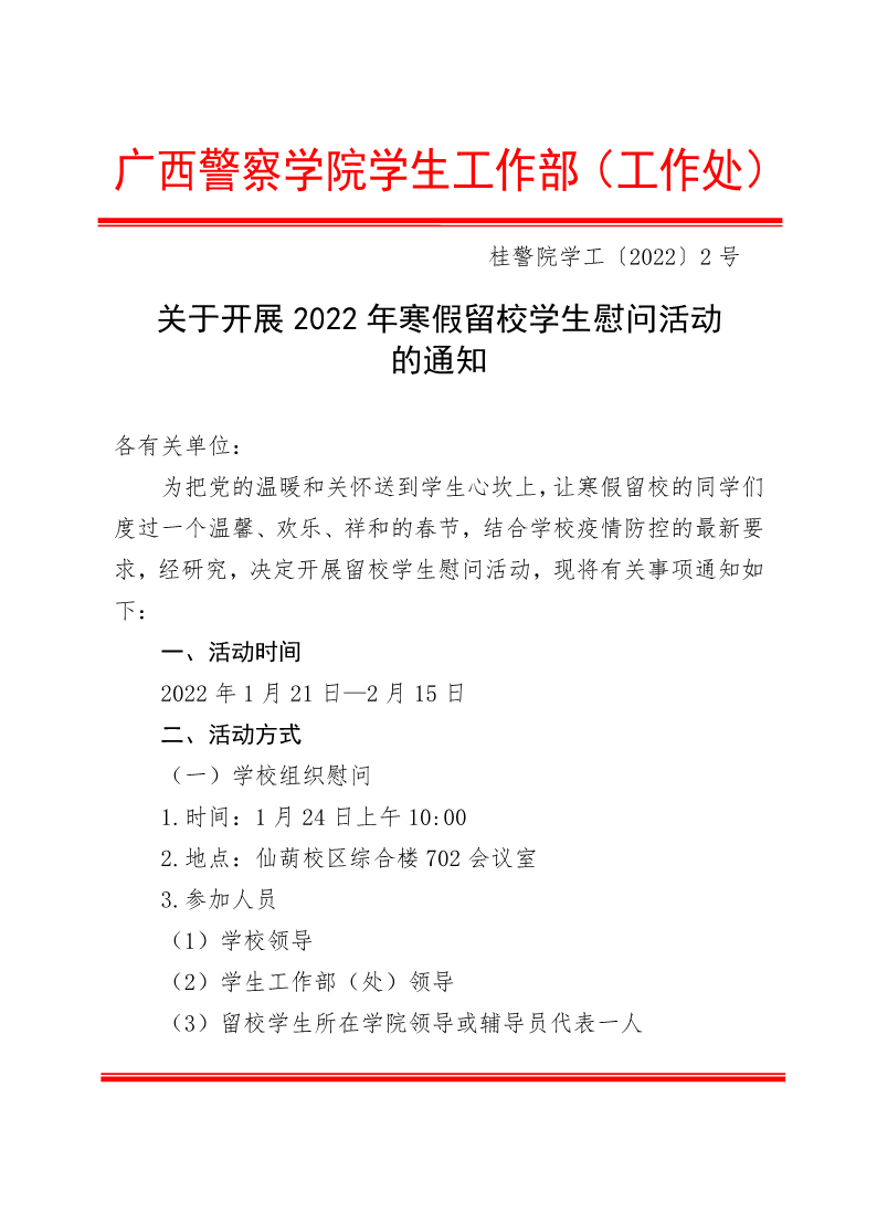 关于开展2022年寒假留校学生慰问工作的通知 来源: 发布时间:2022-01-17 11:00:35 浏览次数: 次 【字体:小 大】 附件:2022年寒假留校学生慰问座谈会参会名单.pdf 分享到: 【打印正文】