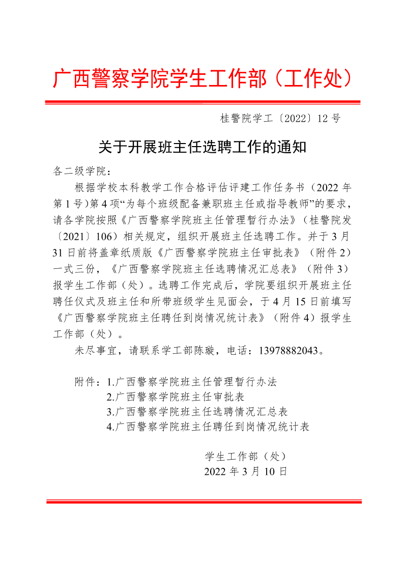 关于开展班主任选聘工作的通知 来源: 发布时间:2022-03-10 11:00:46 浏览次数: 次 【字体:小 大】 附件1: bat365中文官方网站关于印发班主任管理暂行办法的通知.pdf附件2:bat365中文官方网站班主任审批表.pdf附件3:bat365中文官方网站班主任选聘情况汇总表.pdf附件4: bat365中文官方网站班主任聘任到岗情况统计表.pdf 分享到: 【打印正文】