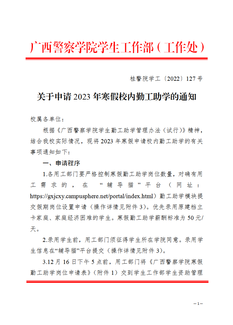 关于申请2023年寒假校内勤工助学的通知 来源: 发布时间:2022-12-13 11:00:23 浏览次数: 次 【字体:小 大】 附件1: bat365中文官方网站寒假勤工助学岗位申请表.pdf附件2: 2023年寒假勤工助学报酬预先发放表.pdf附件3 :“辅导猫”平台申请勤工助学假期岗位流程.pdf 分享到: 【打印正文】