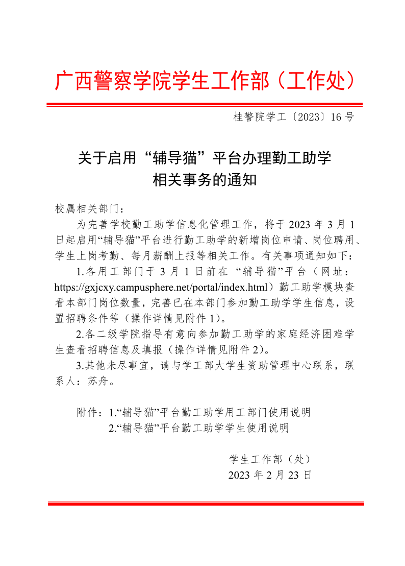 关于启用“辅导猫”平台办理勤工助学相关事务的通知 来源: 发布时间:2023-02-23 09:00:14 浏览次数: 次 【字体:小 大】 附件1 :“辅导猫”平台勤工助学用工部门使用说明.pdf附件2: “辅导猫”平台勤工助学学生使用说明.pdf 分享到: 【打印正文】