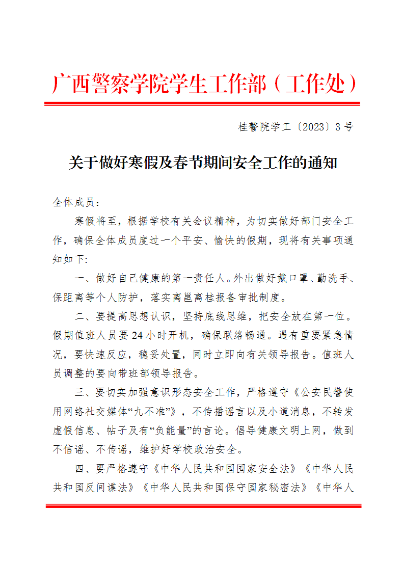 关于做好寒假及春节期间安全工作的通知