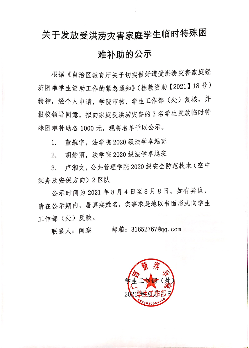 关于发放受洪涝灾害家庭学生临时特殊困难补助的公示