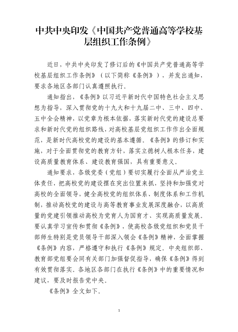 中共中央印发《中国共产党普通高等学校基层组织工作条例》