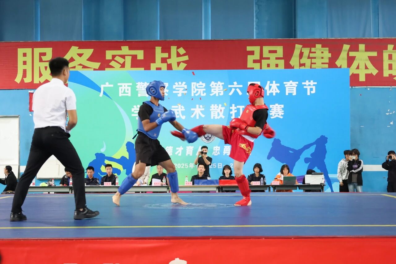 裁判哨声划破长空,散打运动员即刻进入竞技状态。赛场上,红蓝双方拳套交错,攻势凌厉,迅猛的突进动作与精湛的技战术配合,力量与技巧完美结合,迅速点燃全场比赛氛围。每次精彩的抱摔,每套凌厉的组合拳,都是他们日常训练的沉淀,尽显刑技学子的铁血精神。