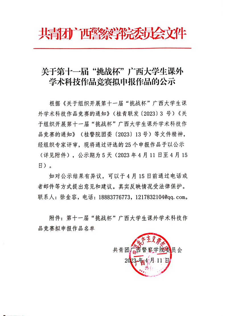 关于第十一届“挑战杯”广西大学生课外学术科技作品竞赛拟申报作品的公示