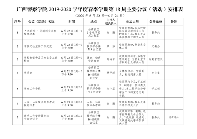 学校第18周主要会议(活动)安排(2020.6.22.-6.24.)