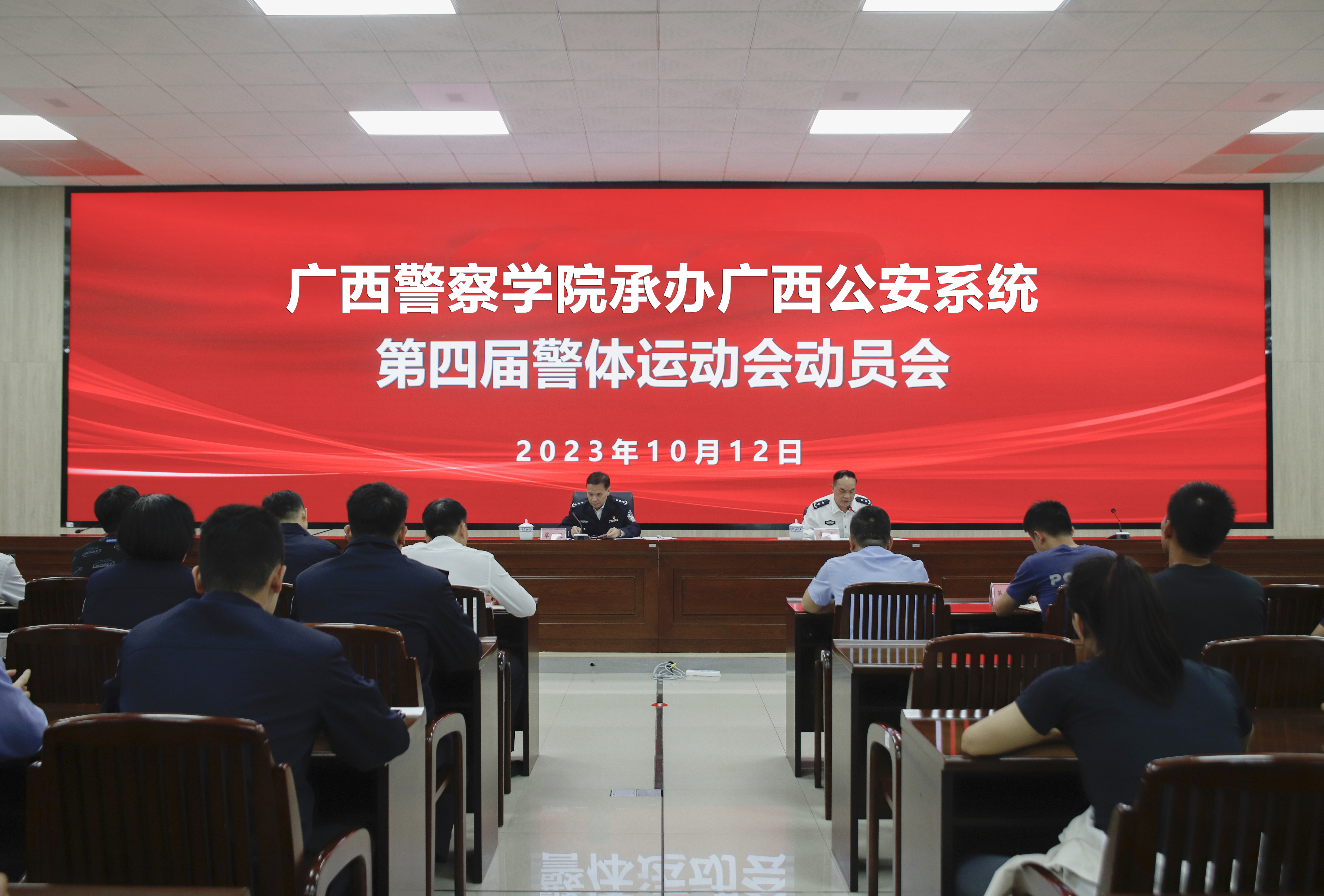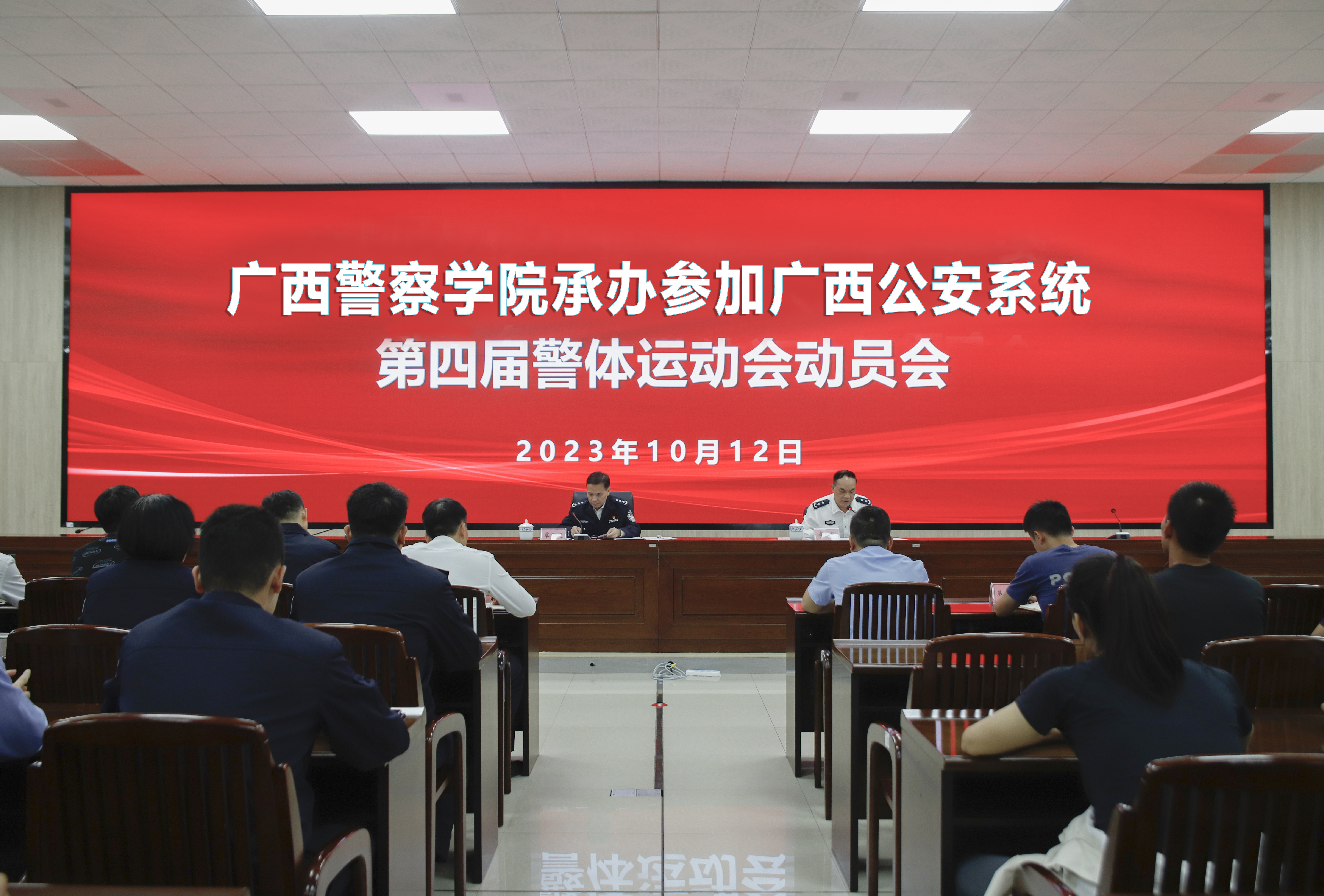 覃干超作动员讲话,他指出,举办警察体育运动会是落实党在新时代的建警治警方针、锻造“四个铁一般”公安铁军的重要举措,也是活跃警院文化、激发队伍活力、促进实战教学、展示公安高等教育成果的重要牵引。自治区公安厅将开幕式和部分赛事举办任务放在学校,体现了对学校的高度信任和亲切关怀,大家要切实提高思想认识,积极投入运动会各项工作之中。要统筹抓好赛事筹备与备战参赛两项重点任务,在筹备方面落实落细各项工作,守住安全办赛底线,做好应急保障准备,确保开幕式和相关比赛平稳有序进行,在参赛方面要科学精准施训,以最佳状态投入赛前集训和比赛,努力做到“办赛精彩、参赛出彩”。要正确处理工训矛盾、学训矛盾,确保办赛参赛工作和迎评促建工作同步高质高效推进。