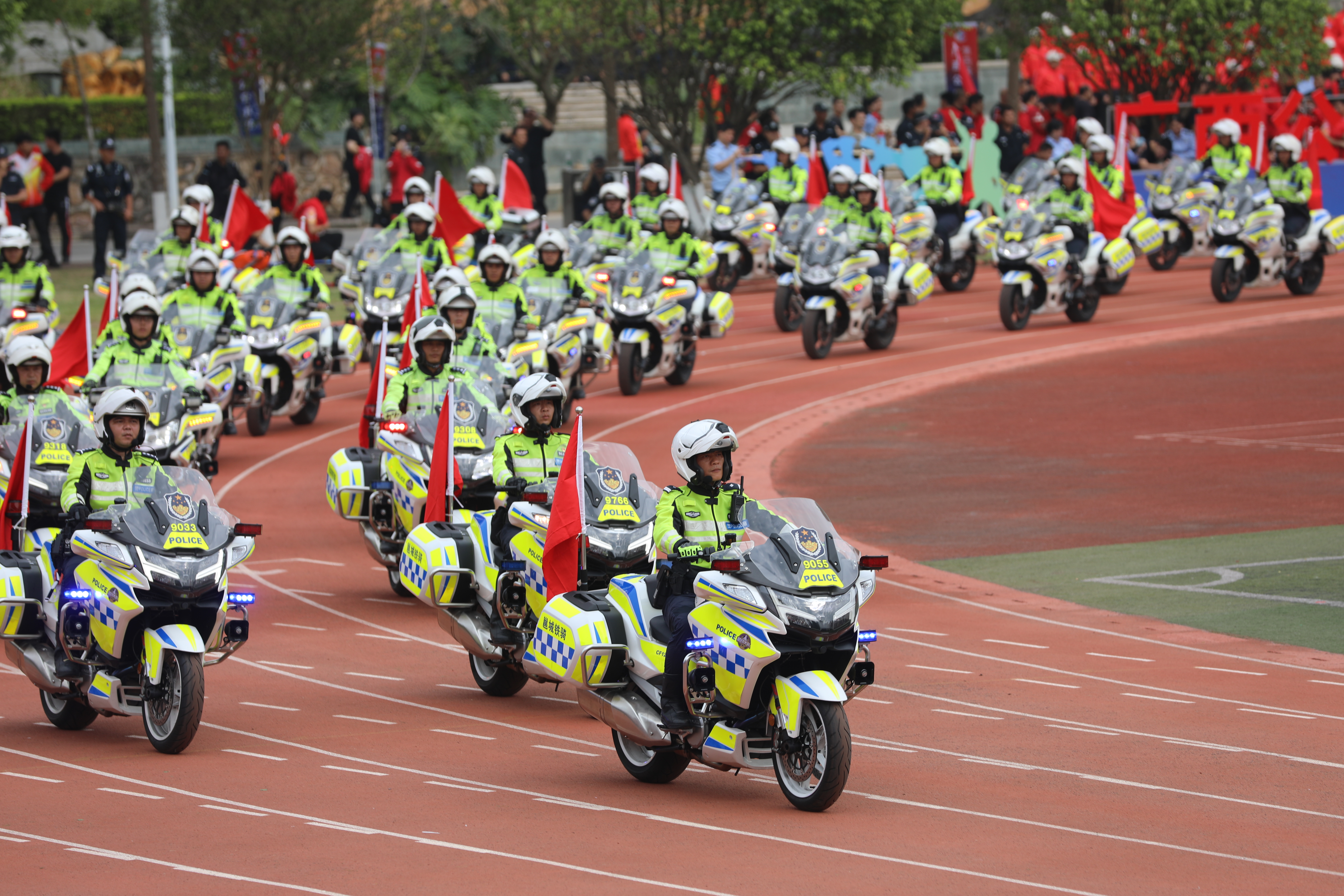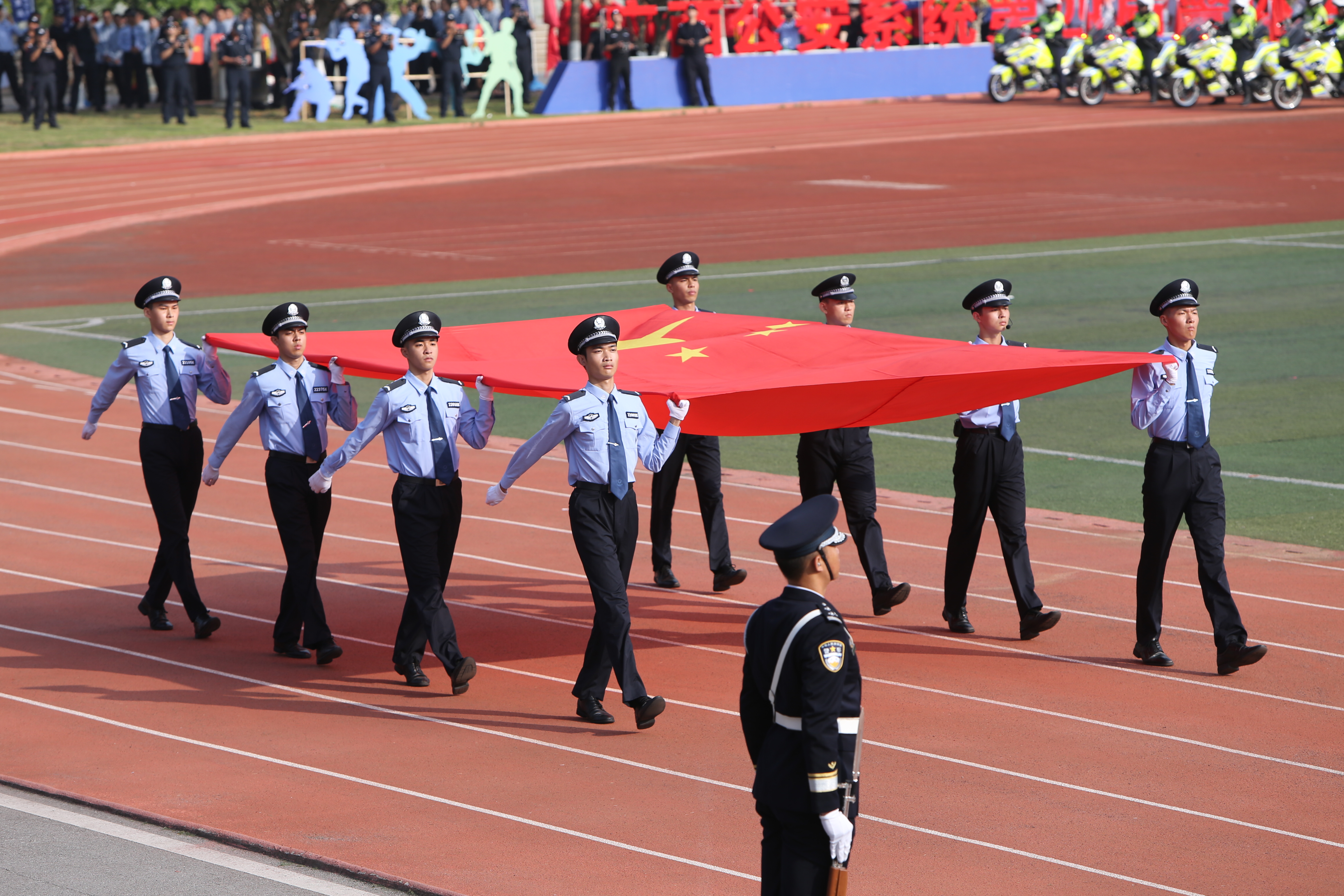 在威武雄壮的乐曲声中,国旗护卫队、警旗警徽方队、无人机编队、运动会标识护卫队、红旗方队、警用摩托车方队、裁判员代表队先后入场。