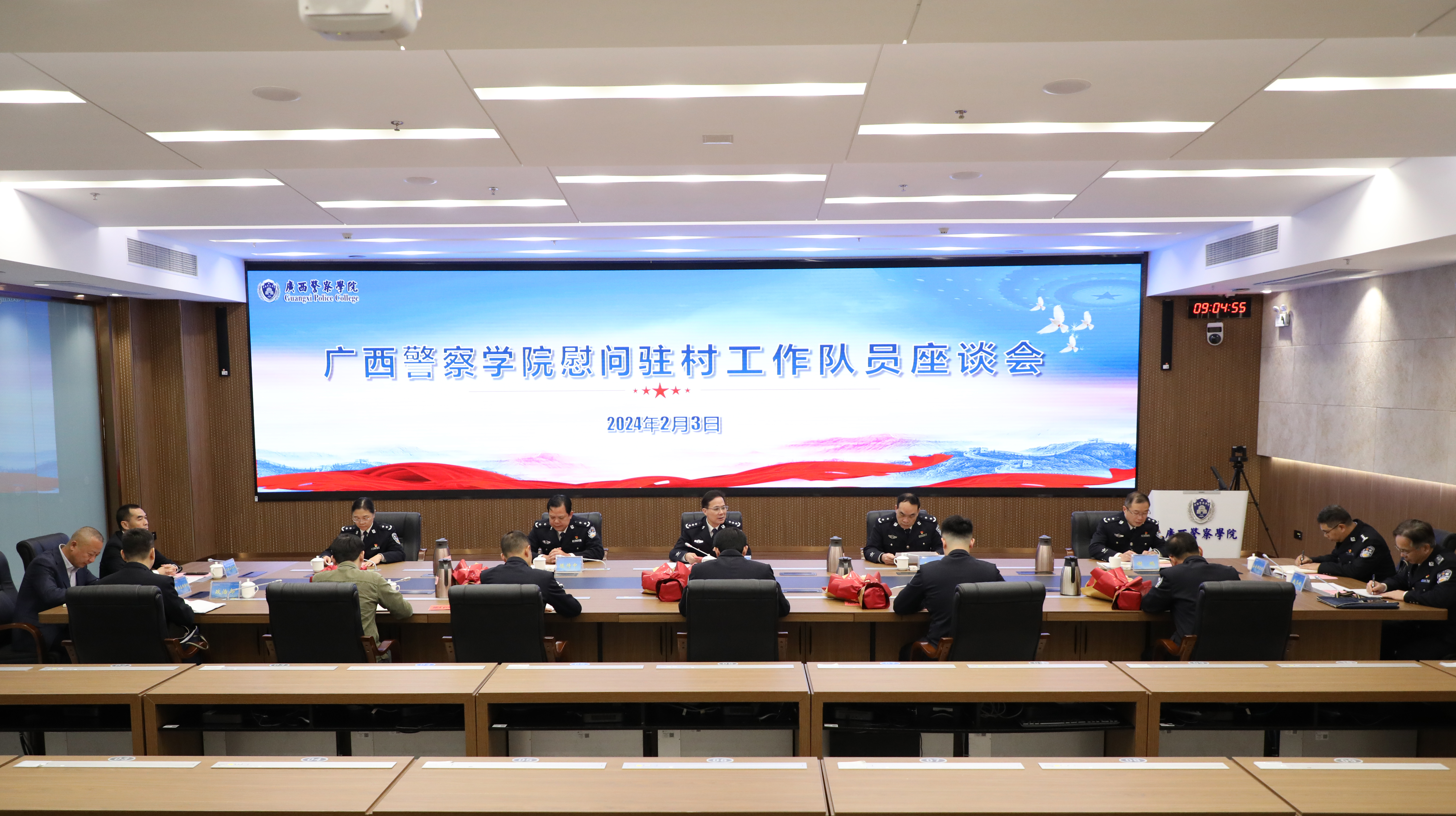 2月3日,学校在仙葫校区公安研训基地召开驻村干部慰问座谈会,校领导覃干超、李克、陈恃中、谢鹏、叶露出席会议,驻村干部王鑫明、章志文、蓝国墉、黄雷文、杨洋,学校驻村干部派出单位党组织负责人参加会议。参会的驻村第一书记、工作队员分别汇报了驻村一年来抓班子、强党建、促致富、惠民生等方面的工作情况。学校党委书记覃干超对第一书记、工作队员们全身心投入乡村振兴工作并取得良好成绩给予了充分肯定,并代表学校党委向全体工作在乡村振兴工作一线的同志们表示诚挚的祝福和美好的祝愿。覃干超要求学校驻村第一书记和工作队员们提高政治站位、强化责任意识、严格遵守纪律,深入学习贯彻习近平总书记关于“三农”工作的重要论述和对广西重大方略要求,认真落实中央和自治区关于乡村振兴工作各项决策部署,充分发扬人民警察特别能吃苦特别能战斗的优良作风,以实际行动展现警院帮扶干部良好的精神风貌,扎实推进乡村振兴各项工作,推动群众持续受益、村庄更好发展,驻村工作结出更加丰硕的果实。