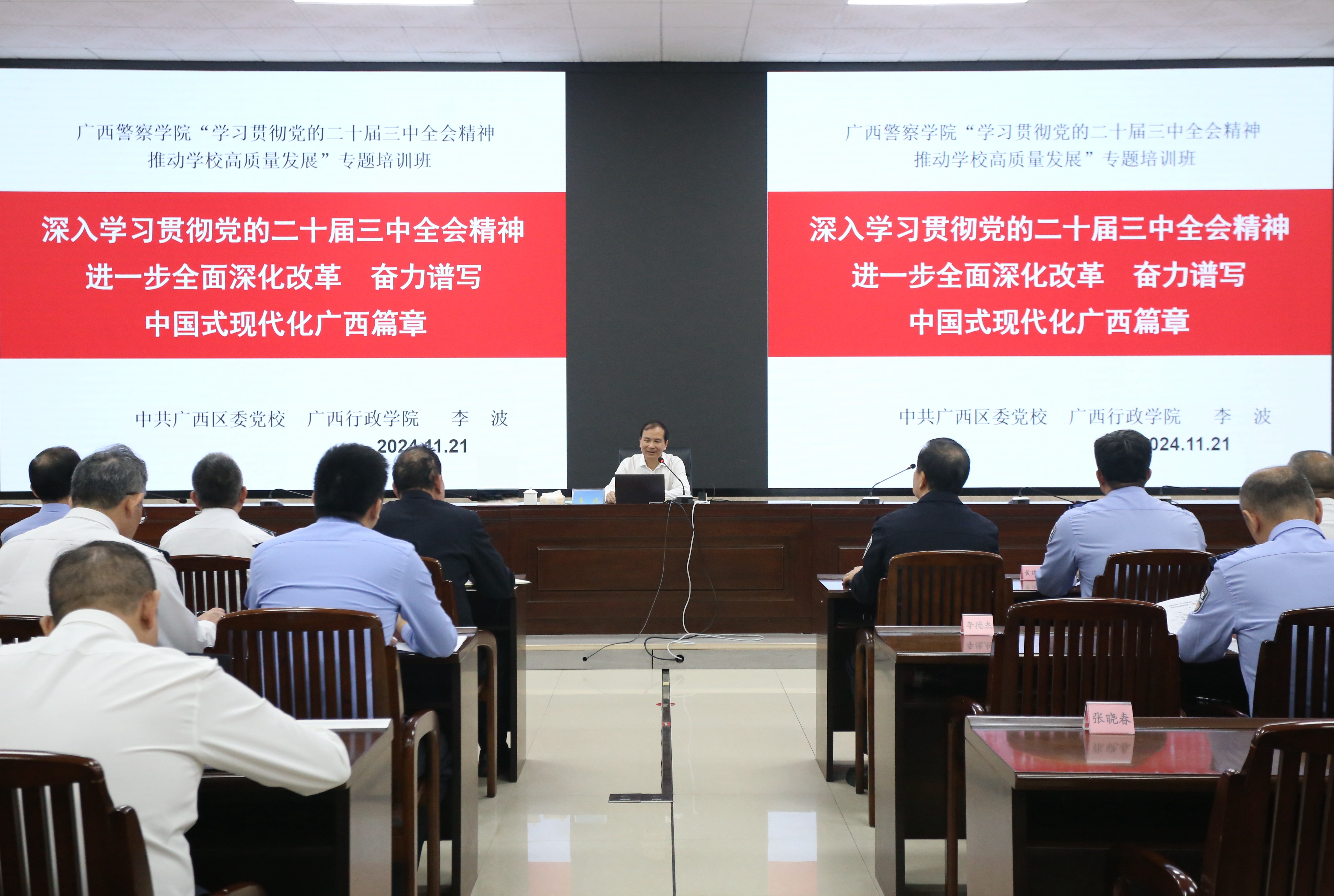 本次专题培训班设专题辅导、座谈研讨、现场教学等环节。在专题辅导环节,学校党委书记彭顺克紧密结合当前学校工作实际,以《深入学习贯彻党的二十届三中全会精神 进一步全面深化教育教学综合改革 奋力推动学校高质量发展》为题作培训班首场专题讲座,从深入学习把握党的二十届三中全会的丰富内涵和全会关于教育工作、公安工作的重要部署,推动全会精神在学校落地落实等方面进行讲授。
