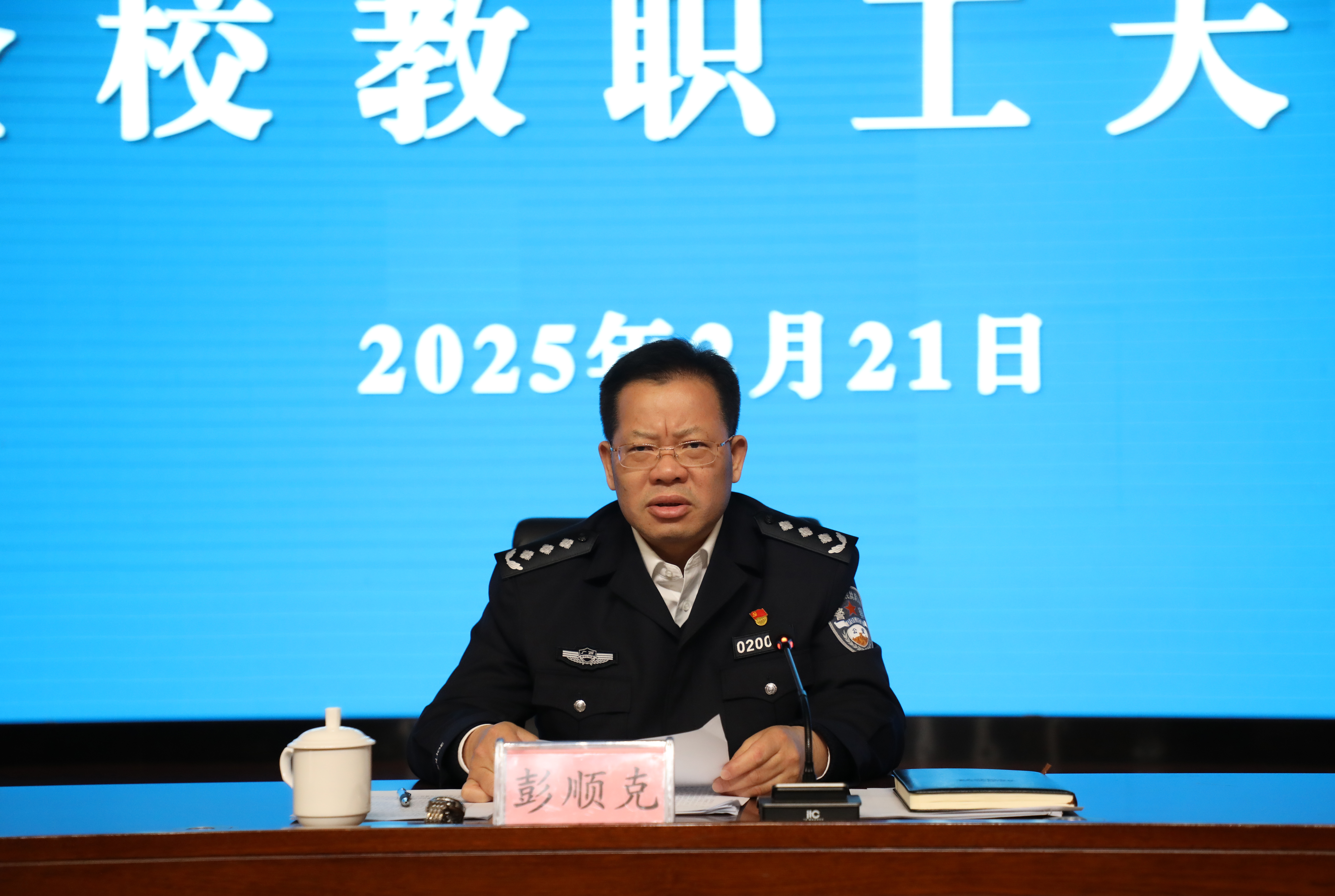 彭顺克强调,2025年是“十四五”规划收官之年,也是进一步全面深化改革的重要一年,要坚持稳中求进、以进促稳,守正创新、先立后破,系统集成、协同配合,打好主动仗、阵地仗、合围仗、整体仗。一是坚持党的绝对领导、全面领导,确保正确办学方向,推动理论武装、学校党政领导班子建设、意识形态工作责任落实、特色校园文化建设“四个强化”。二是坚持服务公安机关新质战斗力主线,确保人才培养质量,聚焦“四个着力”开展工作,即着力推动学科交叉做优专业建设,着力深化实战化教学改革,着力构建数智赋能教学新范式,着力加强警务化管理。三是坚持落实科技兴警三年行动计划,确保科研水平明显提升,要围绕构建激励约束并重的管理制度、建强高水平科研团队、打造特色智库服务国家战略需求、科研成果转化等“四个抓手”,强化有组织科研,形成“战略需求牵引—团队集智攻关—成果实战转化”的全链条创新生态。四是坚持目标导向,确保学校内涵建设稳中有进,统筹好新增硕士学位授予单位申报立项建设,统筹好审核评估自评自建,统筹好规划衔接与战略布局,统筹好学校内涵建设的财力保障,以“四个统筹”推动学校提档升级。五是坚持服务国家外交大局和安全战略,确保高水平教育对外开放不断拓展,用好科研服务平台,建好外警培训平台,办好专业发展平台,依托“三个平台”,肩负好维护民族团结、服务国家战略的使命担当。六是坚持统筹高质量发展和高水平安全,确保学校安全稳定,做到风险隐患排查化解工作机制、重点人员关心帮扶的全程闭环、安全工作责任制“三个落实”。