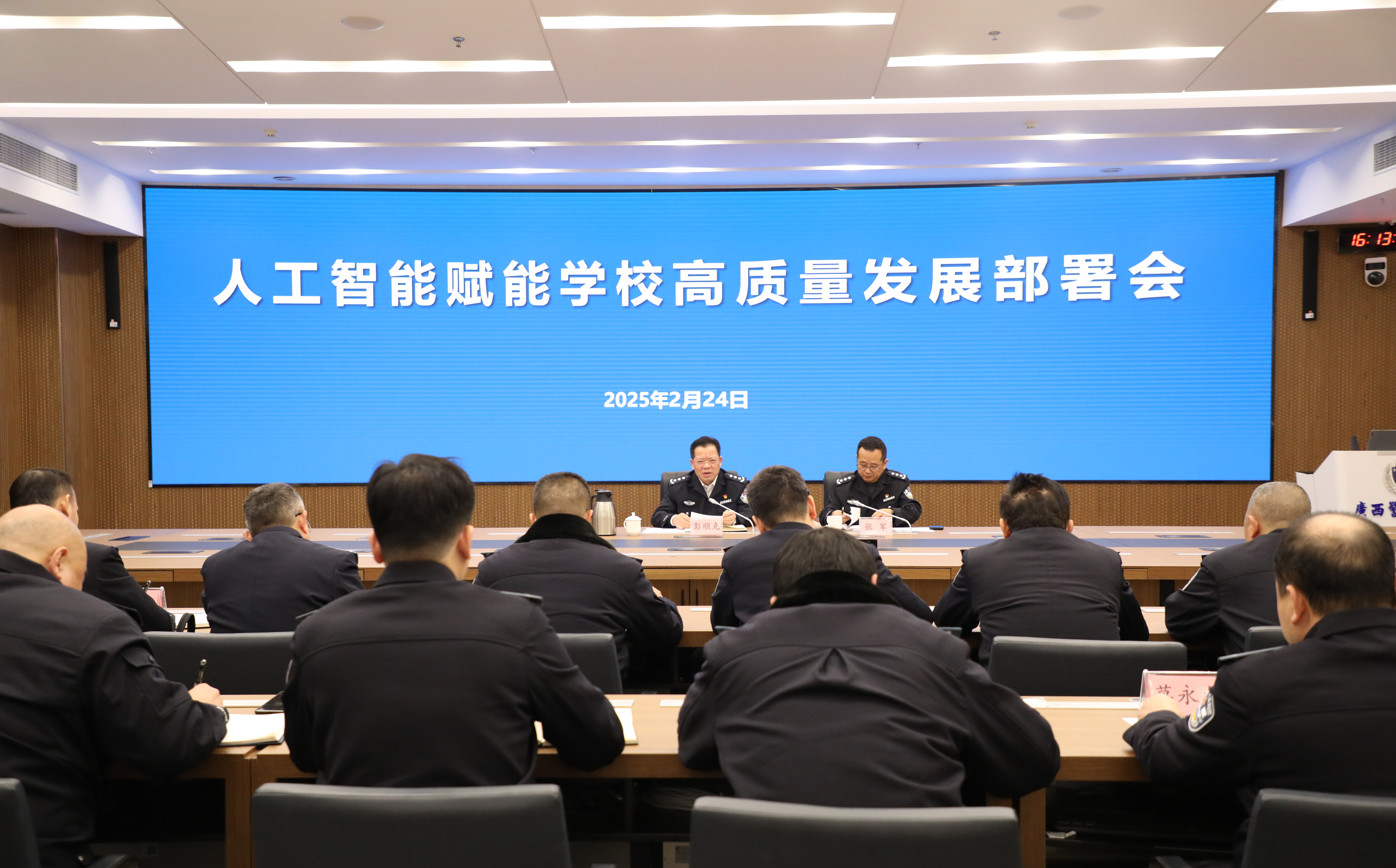 2月24日,bat365在仙葫校区智慧公安研训基地召开人工智能赋能学校高质量发展部署会,贯彻落实自治区党委“以‘人工智能+’赋能千行百业”要求,贯彻自治区党委教育工委、自治区公安厅党委相关要求,捕捉高质量发展机会,加快推进学校数字化建设。学校党委书记彭顺克出席会议并讲话。校长张军主持会议。