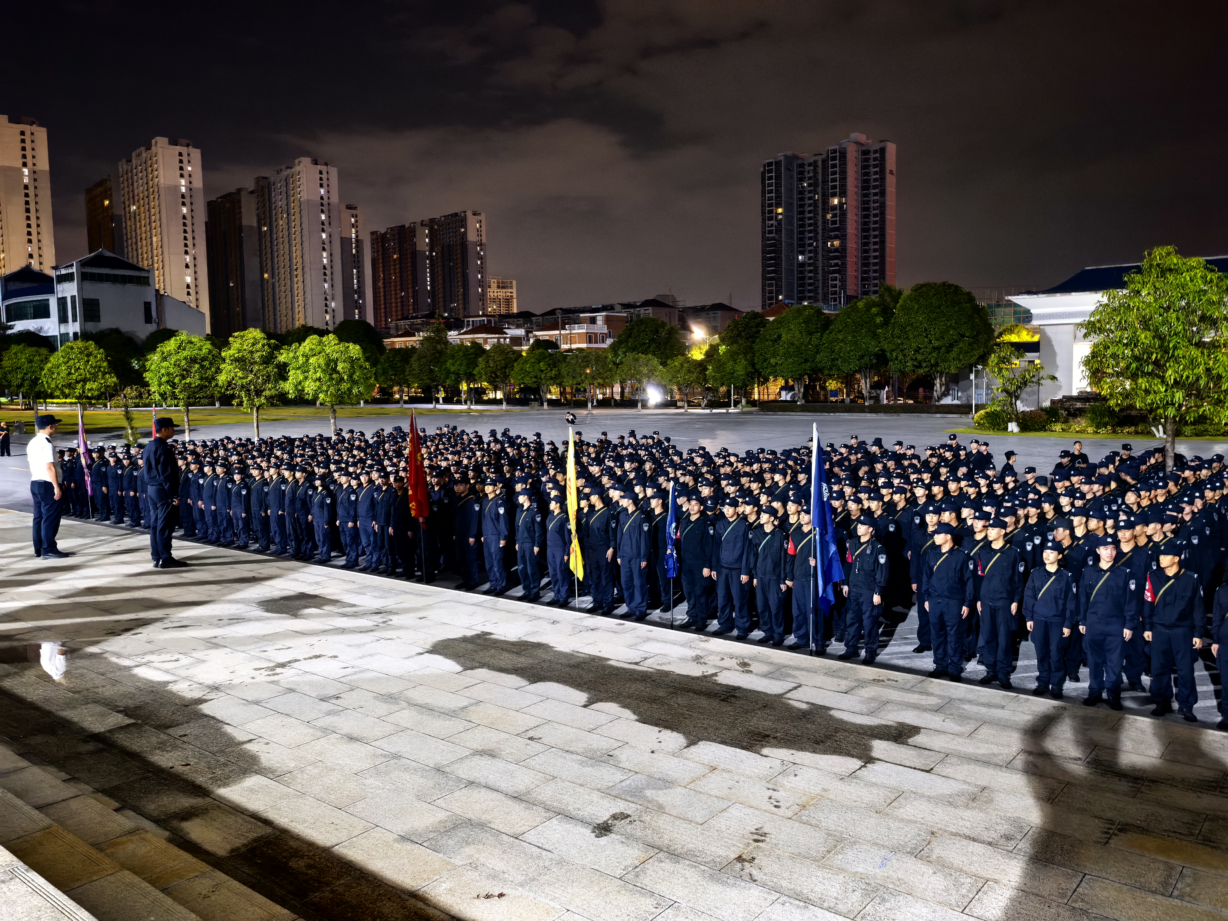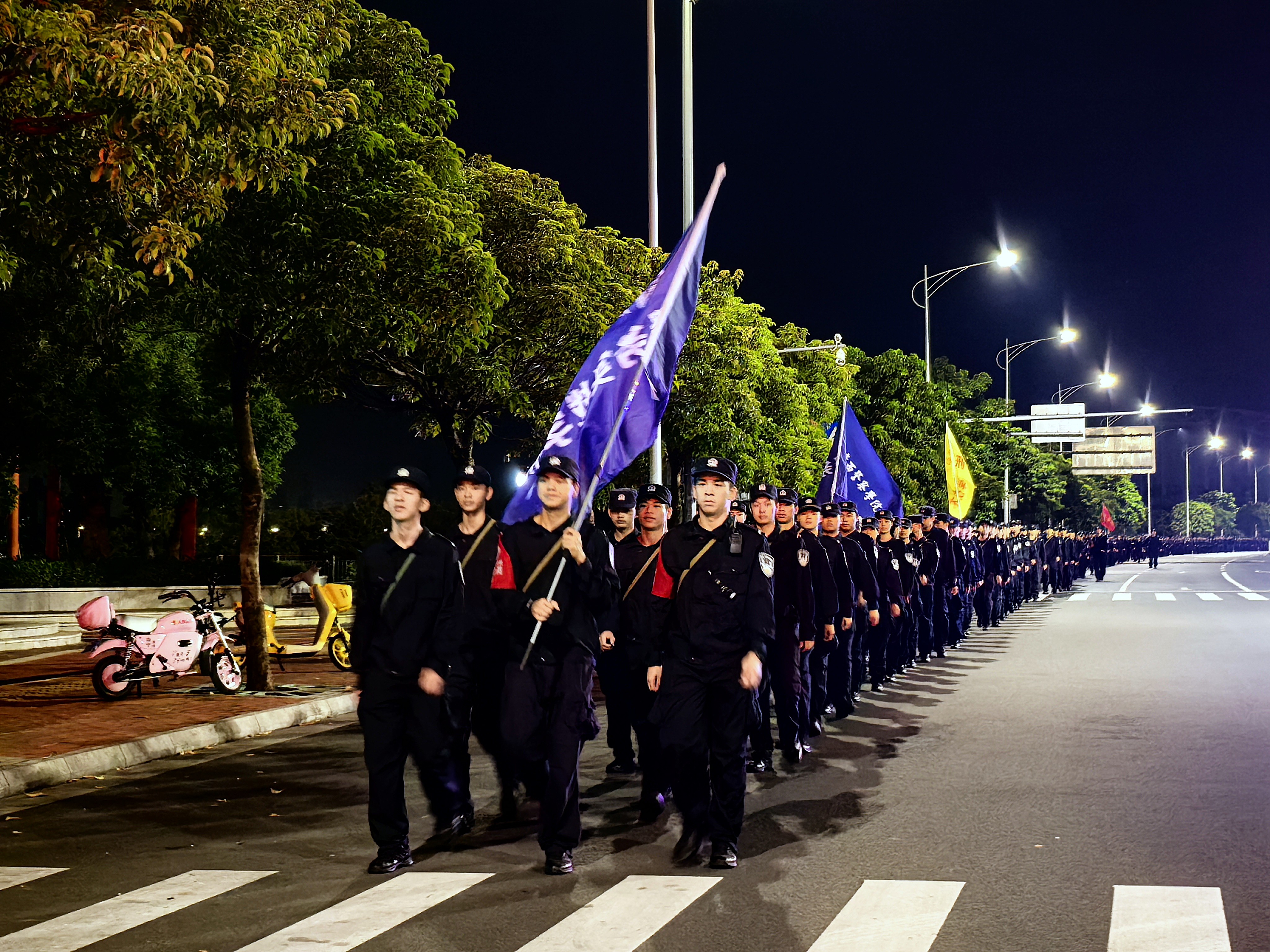 拉练途中,同学们精神饱满,阔步向前,各学院旗手们昂首挺胸,稳稳擎住旗帜,一面面院旗在夜色里格外醒目,成为队伍中最亮眼的“领航标”。面对10 公里的征途挑战,无人退缩、无人懈怠,大家相互鼓劲、并肩前行,排成紧密的纵队,彼此间保持着整齐的间距,整个队伍的行进整齐矫健。从黑夜到黎明,从市区道路到江岸,队伍始终保持着昂扬的姿态,每一步都充满力量,每一声呐喊都饱含信念,生动展现出警院学子不畏艰难、勇毅前行的精神风貌。各学院学管干部、辅导员引导保障,指挥车、后勤保障车、救护车全程随行,校属相关部门协同合作,学校与公安交管部门配合共同保障,拉练活动安全有序。
