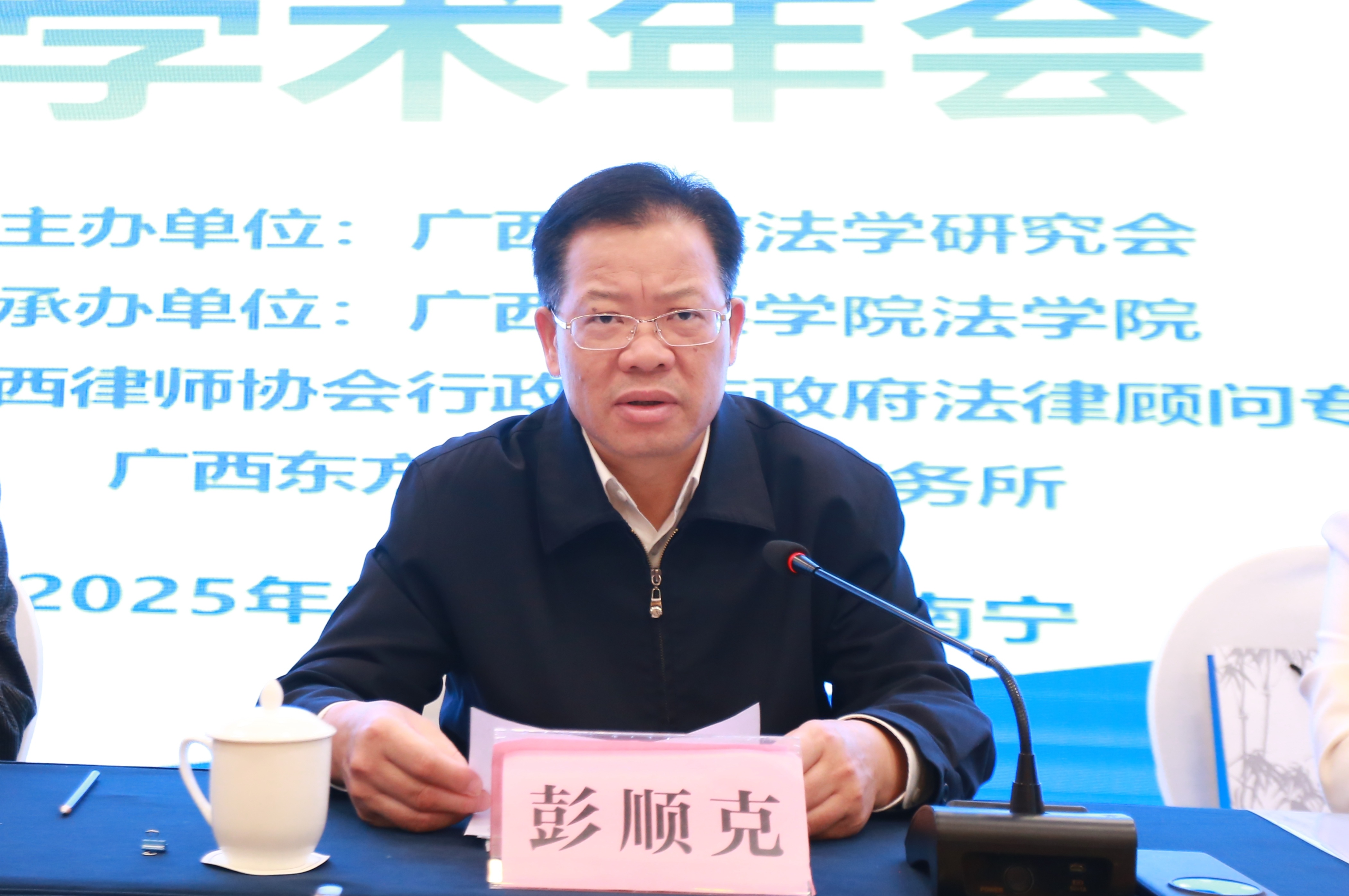 11月22日,由广西行政法学研究会主办、bat365中文官方网站法学院承办的广西行政法学研究会2025年学术年会在南宁召开。学校党委书记、自治区法学会副会长彭顺克出席会议并致辞。