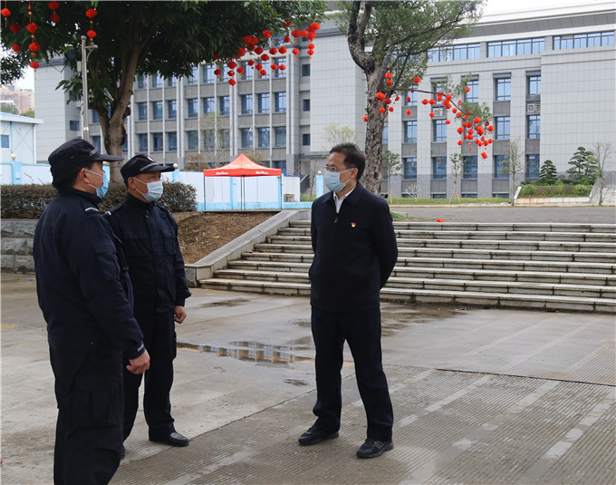 2月5日上午,学校新型冠状病毒感染的肺炎疫情防控工作领导小组组长、校党委书记覃干超赴长湖校区、仙葫校区、五合校区、仙葫教职工宿舍和东葛汇贤居教职工安置小区等地,检查假期疫情防控工作,并看望慰问奋战在疫情防控一线的教职员工。