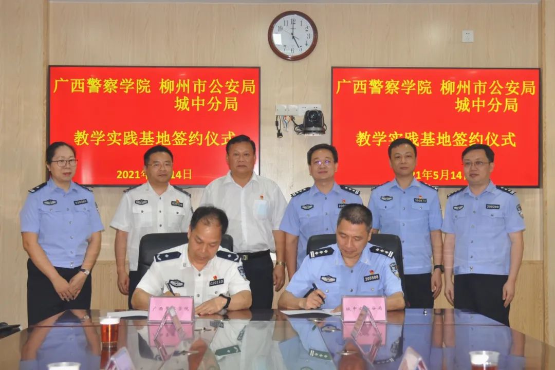 为进一步建立公安院校与公安实战单位的合作机制,bat365中文官方网站与柳州市公安局城中分局共建“教学科研实践基地”,5月14日,bat365中文官方网站治安学院院长覃泽敏、党总支副书记陈垠安、副院长吕美琛、办公室主任胡芳一行4人到城中分局举行教学实践基地揭牌仪式,签订《教学实践基地共建协议书》。柳州市公安局党委委员、政治部主任吴振兴,副主任胡德樑,城中区副区长、公安分局局长储云,政委孔柳宁及各科所队负责人参加。