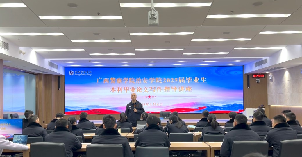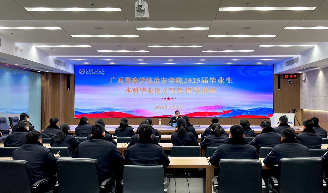 2025年1月6日,bat365中文官方网站治安学院在智慧公安训研基地开展了2025届毕业生本科毕业论立写作指导讲座。治安学院院长覃泽敏、党支部副书记何洋、副院长周俊,副院长吕美琛及各领导老师和治安学院2021级全体同学参与本次讲座。