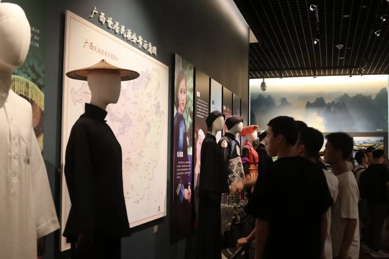 讲解员带领同学们依次参观了博物馆二、三层展厅。通过观摩精美的织锦工艺,同学们深入了解了广西世居民族的文化渊源与特色,切身感受到各民族文化的蓬勃生机和先民的智慧结晶。