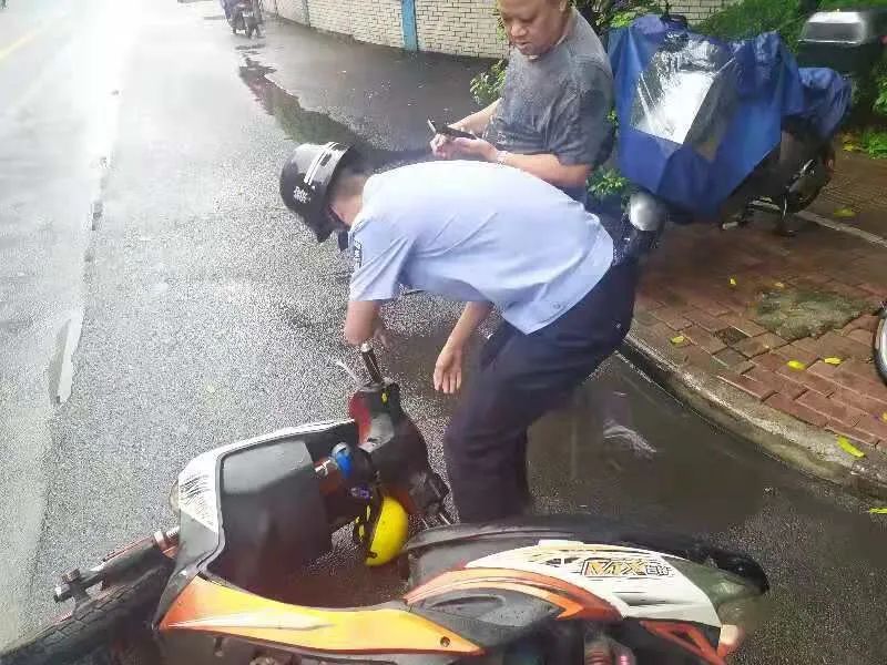 向阳派出所增援学警在雨天执勤过程中帮助骑车摔倒群众。