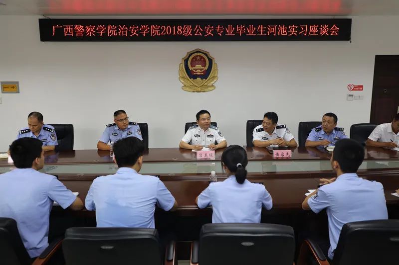 17日下午15时30分,2018级河池实习生座谈会在河池市公安局1914会议室召开。河池市公安局治安支队政委黄启先,河池市公安局政治部副主任韦江滨,河池市公安局金城江分局副局长韦奇成,各实习单位领导代表以及金城江分局实习生参加。