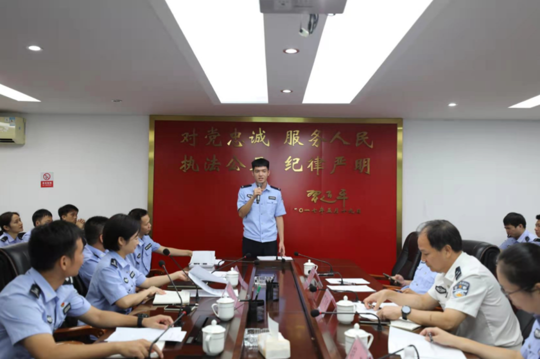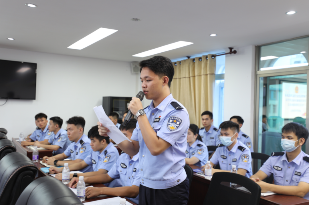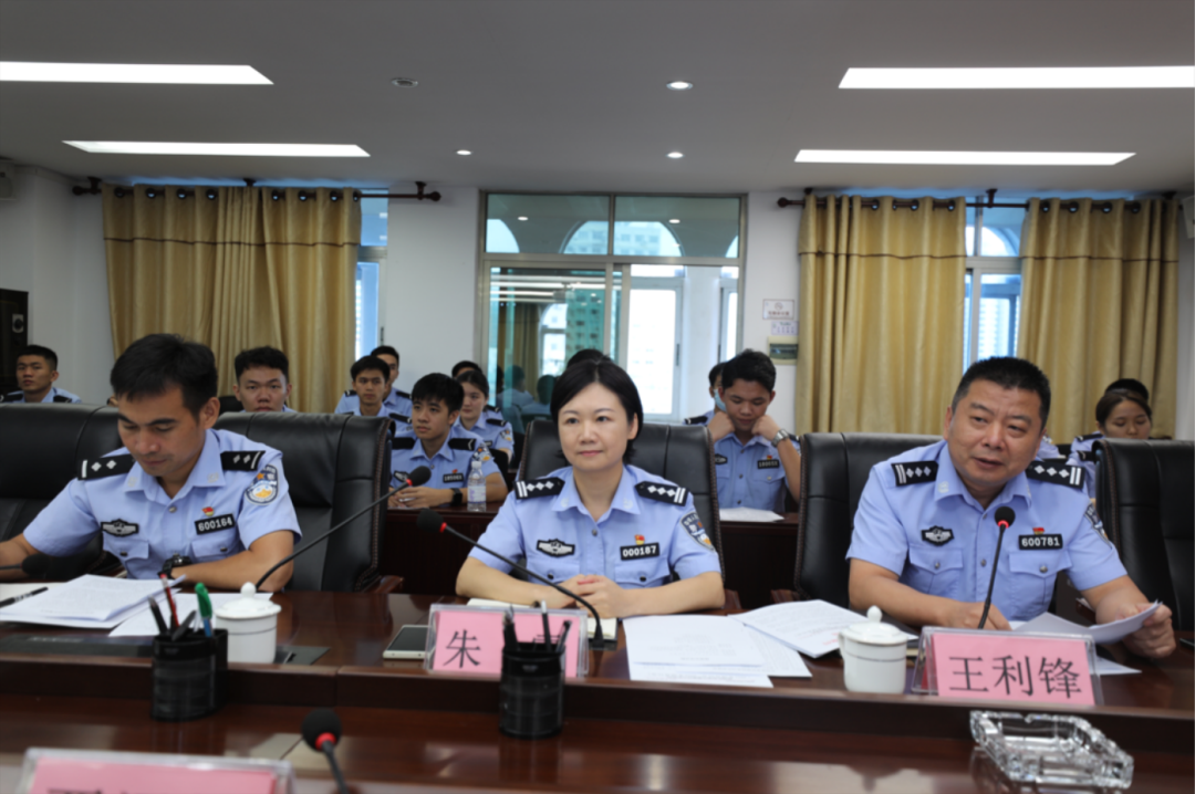北海市海城分局政工室主任王利锋汇报实习生实习情况,海城分局副局长朱霞点评并表达了对治安学院实习生的工作能力、工作态度、为人处世等方面的充分肯定并向实习生们在往后的实习中提出了一些切实的工作建议。
