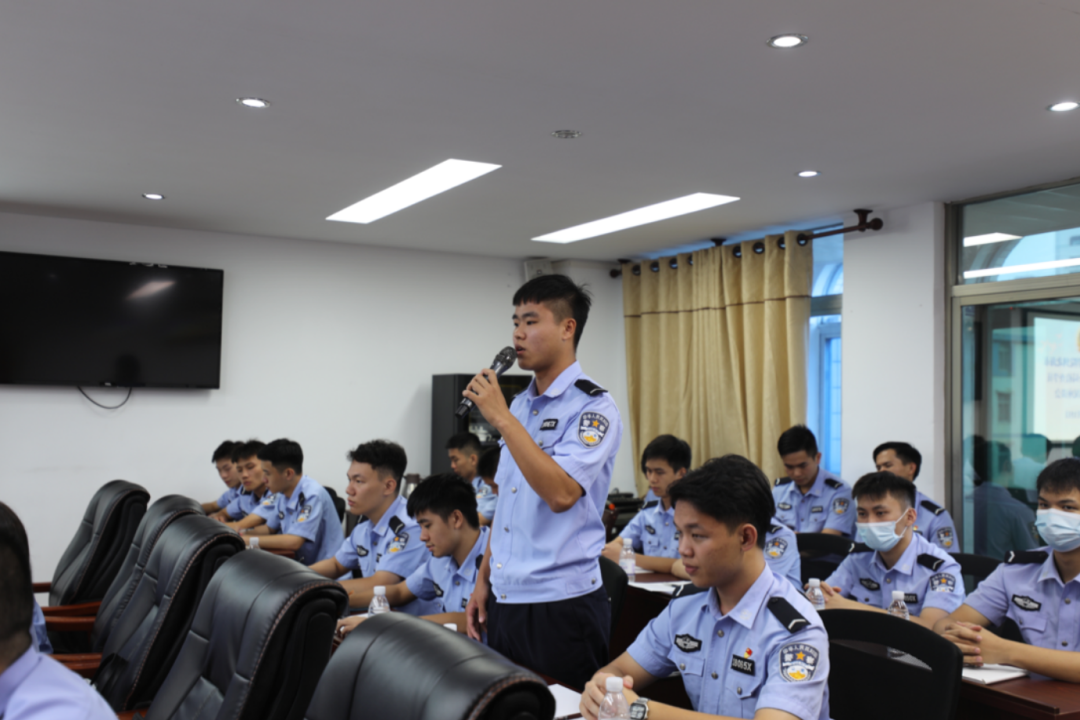 座谈会上,实习生组长周炎汇报治安学院北海实习点三十五名实习生两个半月以来的实习情况。