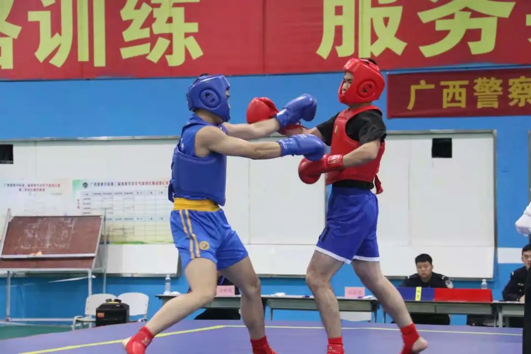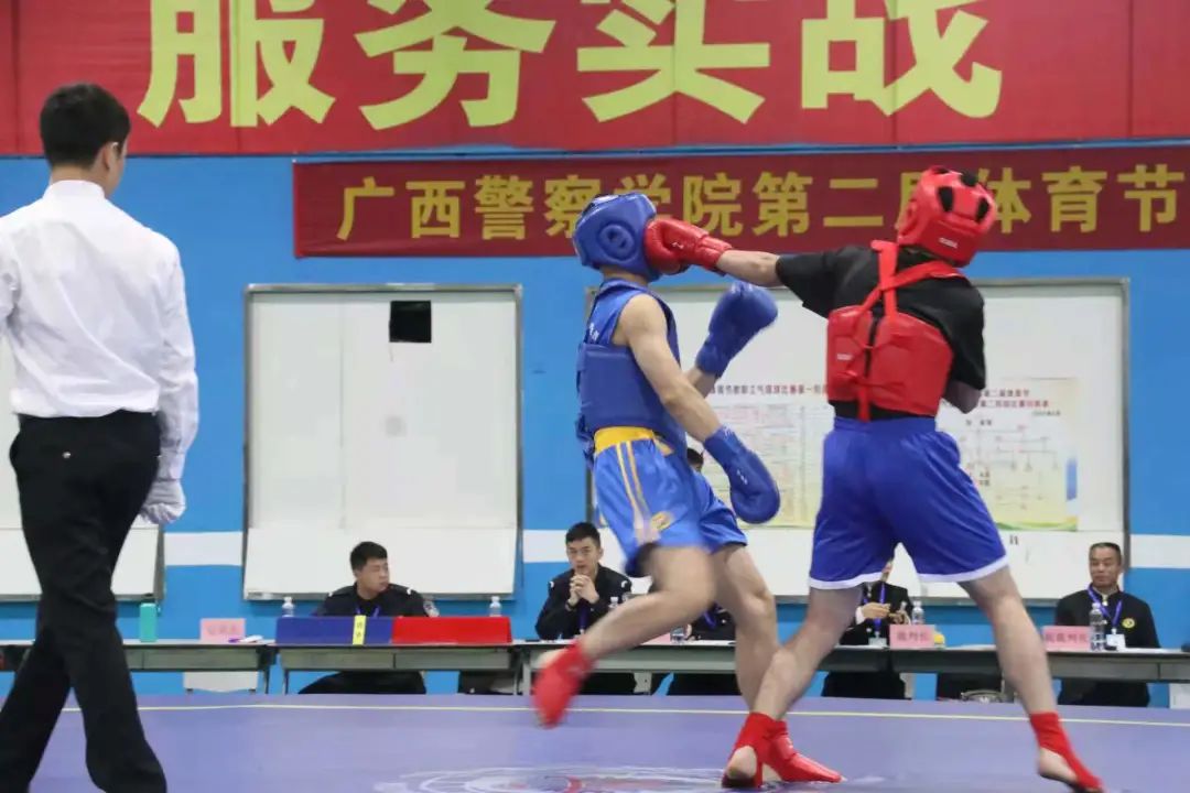 擂台上,运动员以抱拳礼出场,挥拳、踢腿,各展身手,或攻势凶猛、或防守稳健、或出手凌厉,无不展现出治安学院学子的精神风貌与风采。整个竞技台汗水飘洒、场面火爆,运动员的精彩表现赢得现场观众阵阵掌声和欢呼声。