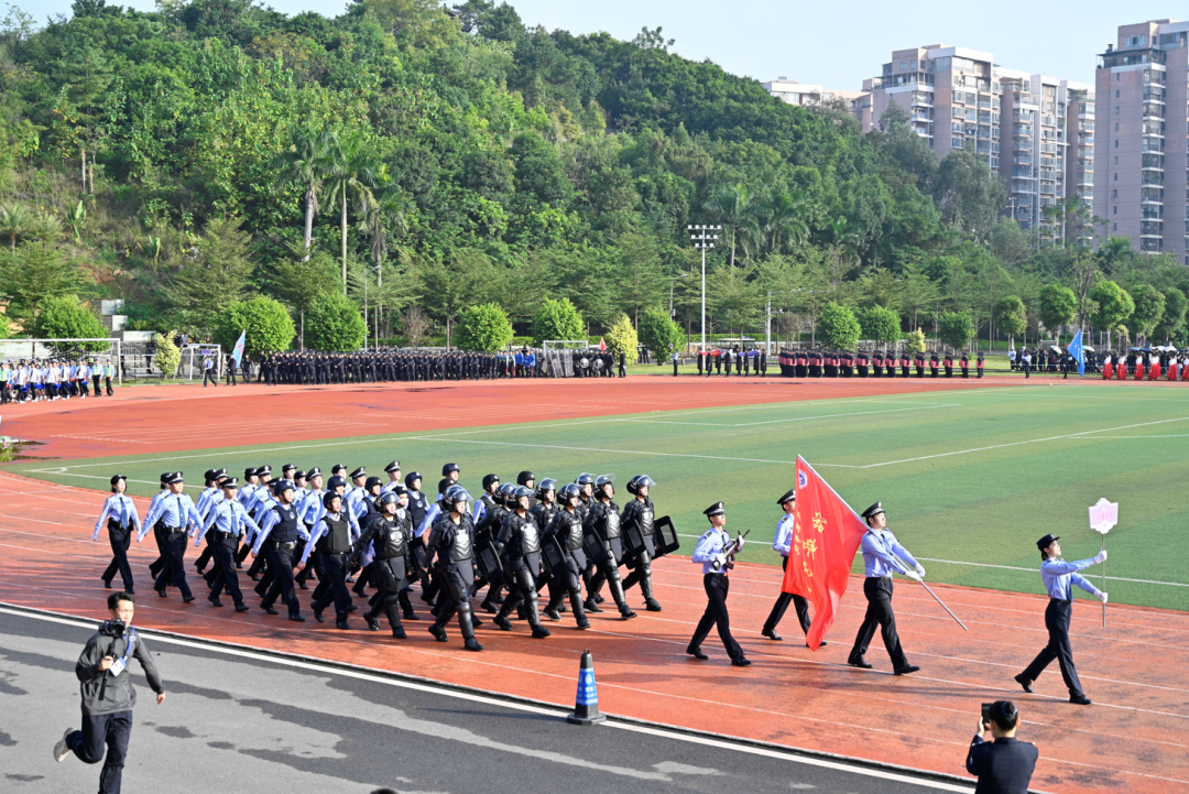 伴随着分列式进行曲,治安学院方阵队员们身着制式长袖衬衣,每一位队员都充分展现着治安学子敢于拼搏的精神风貌,“治安飞扬,气宇轩昂,同心协力,铸就辉煌”的口号响彻云霄。