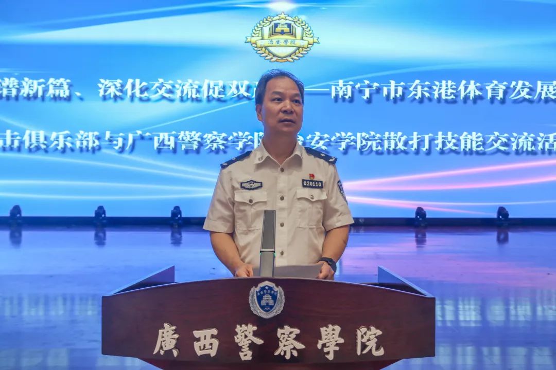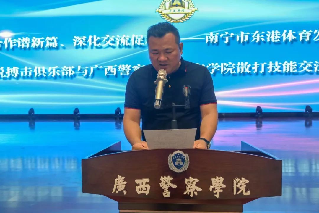 接着由覃泽敏院长代表治安学院全体师生对南宁市东港体育发展有限公司和广西翔锐搏击俱乐部的赞助和支持表示衷心的感谢,并对于企业代表的到来表示热烈的欢迎。覃泽敏院长对后续合作提出了三点要求:一是希望全体同学都能够以实现德、智、体、美、劳全面发展为目标;二是要持续推动学院警务技能训练、提升学生警务实战水平;三要积极提高散打技能,培养坚毅勇敢、敢于拼搏的优良品质和精神面貌。