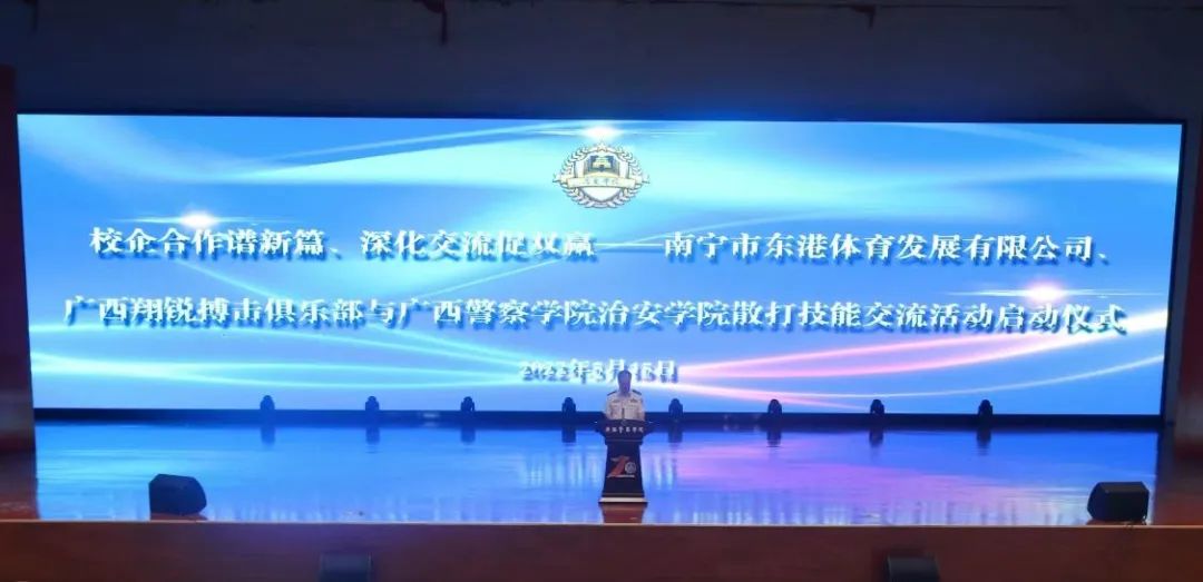 为进一步加强我院与校外企业合作,丰富我院文体生活,提升学生警务实战技能,促进学生德智体全面发展。治安学院于2022年5月15日下午4时在仙葫校区学术报告厅举办“校企合作谱新篇、深化交流促双赢——南宁市东港体育发展有限公司、广西翔锐搏击俱乐部与bat365中文官方网站治安学院散打技能交流活动启动仪式”,企业代表,治安学院党总支书记李林青,院长覃泽敏,党总支副书记陈垠安,以及治安学院全体学生参加。