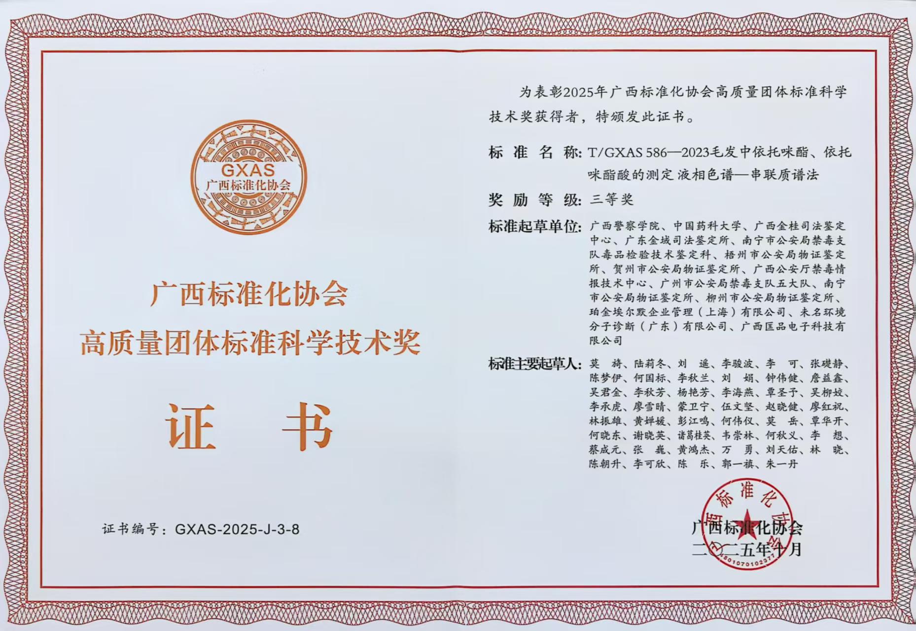 刑事科学技术学院师生科研团队牵头起草的团体标准《依托咪酯测定》荣获“广西标准化协会高质量团体标准科学技术奖”三等奖(2025年)